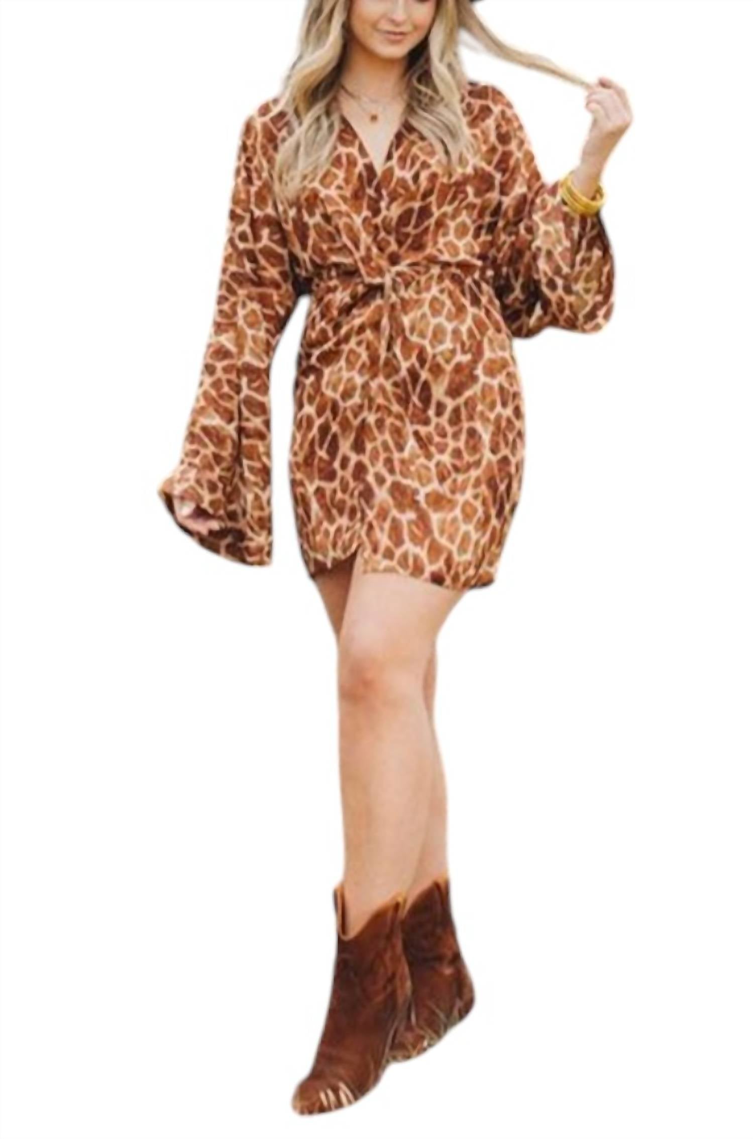 A short and breezy dress for those warmer days.The Gabriella Cocktail Dress by BUDDYLOVE in Giraffe Brown is a captivating mini dress featuring a surplice V-neckline and long kimono sleeves. Made from 100% polyester, it has an A-line silhouette and measures 32" from shoulder to hem. The dress includes an elastic waist with a knotted detail, a back zip closure, and a semi-open back with a button for a playful finish.