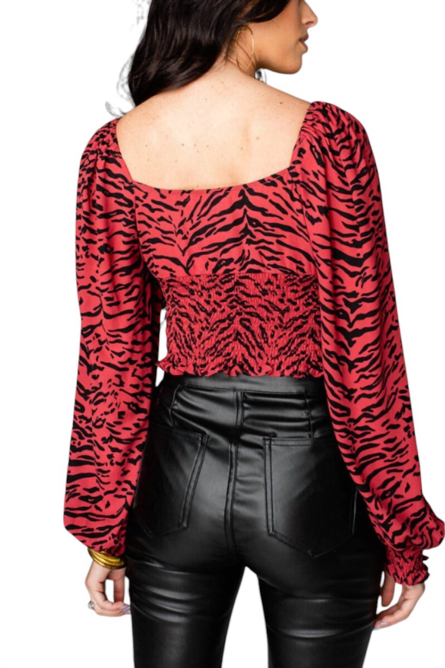 The perfect crop top for those warmer weather days. Introducing the Isabelle Smocked Crop by BUDDYLOVE, a chic addition to your fall wardrobe. This long-sleeve top features a stylish animal print in red and a scoop neckline, perfect for pairing with high-rise denim. Crafted from 100% polyester, it offers a comfortable fit with a smocked waist for added stretch. The cropped length measures 11" from shoulder to hem, and the pull-on closure makes it easy to wear. Designed for activewear, this versatile piece is tailored for a true-to-size fit.