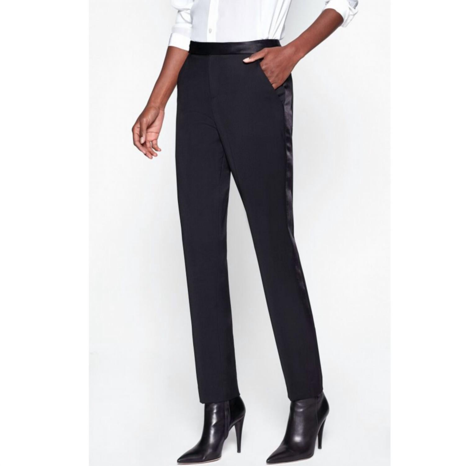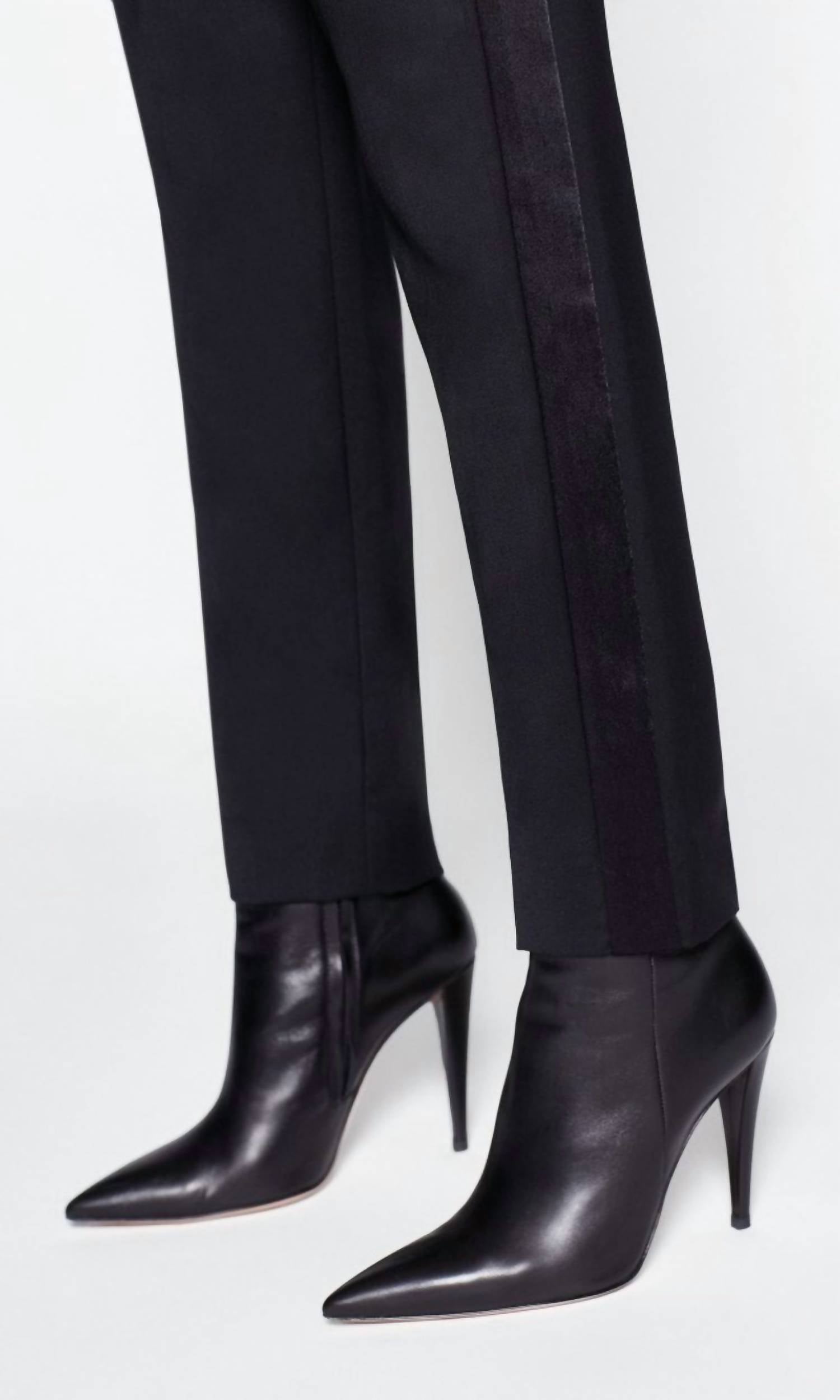 Introducing the Burcet Wool Trouser by Equipment, a modern take on vintage tuxedo pants crafted entirely from solid wool in a true black hue. Designed with a high-rise and a straight leg, these trousers offer a sleek, ankle-grazing length with a 29" inseam. Made in an imported origin, they feature a practical zip closure and convenient pockets. For best results, remember to dry clean only. Model is wearing a size 4 (5'9" height, 33" bust, 23" waist), with a front rise of 10.5". 100% WOOL.