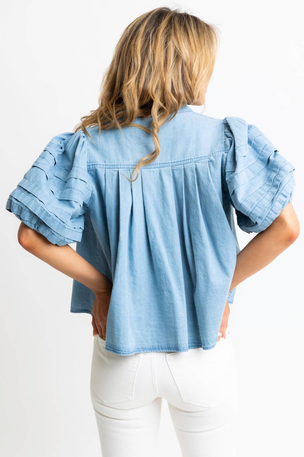 Pair this with your favorite jeans and slides for your next girls night out. Introducing the Karlie Women's Denim Novelty Pleat Top, a stylish summer staple tailored for vacation and streetwear looks. This solid blue blouse features short sleeves and a flattering V-neckline. Crafted for effortless style, it includes a convenient button closure. Available in sizes S (2/4), M (6/8), and L (10/12), this top is designed for comfort and versatility in your warm-weather wardrobe.