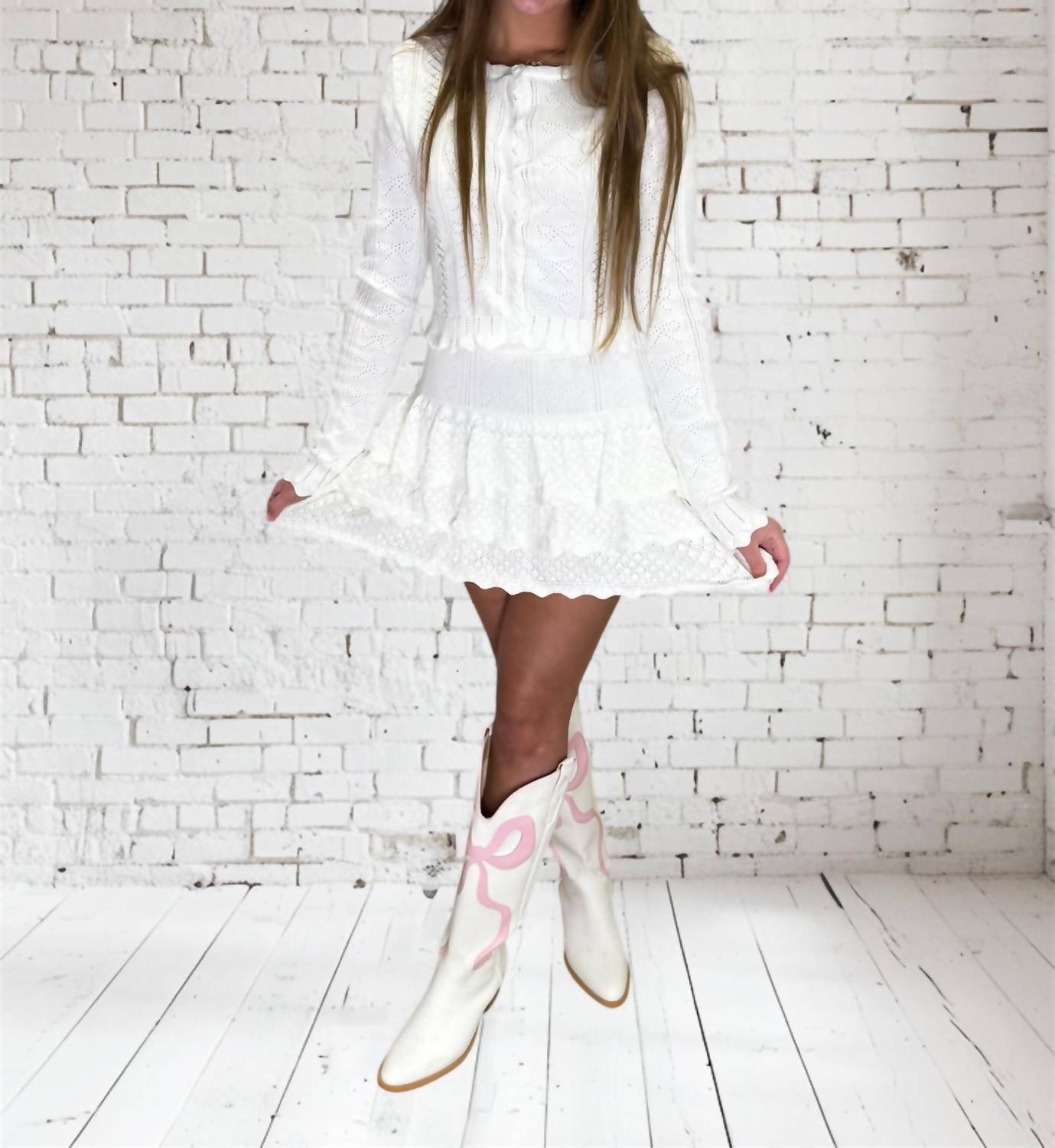 Elevate your summer wardrobe with the Women's Bow Knit Button Top and Skirt Set by MABLE, perfect for a minimalist vacation look in crisp white. This skirt set features a textured pattern, providing a touch of intrigue to the overall design. Closure: Button closure. Carefully selected for its elegant simplicity, this set does not include pockets.