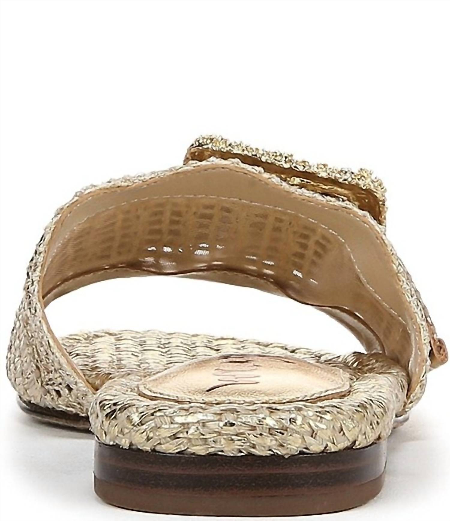 Classicly cute and all-day-wearable. We love this sandal. The Women's Bambi Slide Sandal by Sam Edelman combines luxury and comfort with an oversized ornate buckle and metallic raffia upper in Amber Gold. Designed with a flat heel style, it features a round toe shape and a convenient slip-on design for easy wear. The fabric lining offers additional comfort, while the synthetic outsole ensures durability. With an approximate heel height of 0.5 inches, it's the perfect blend of fashion and function for any occasion.