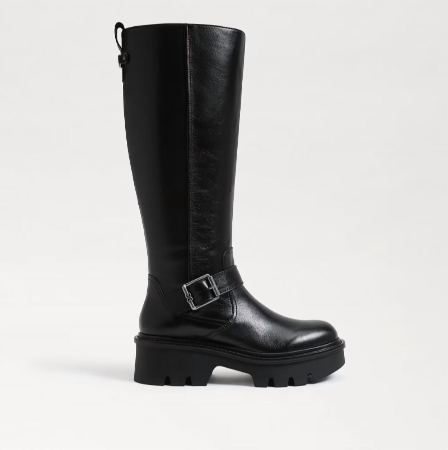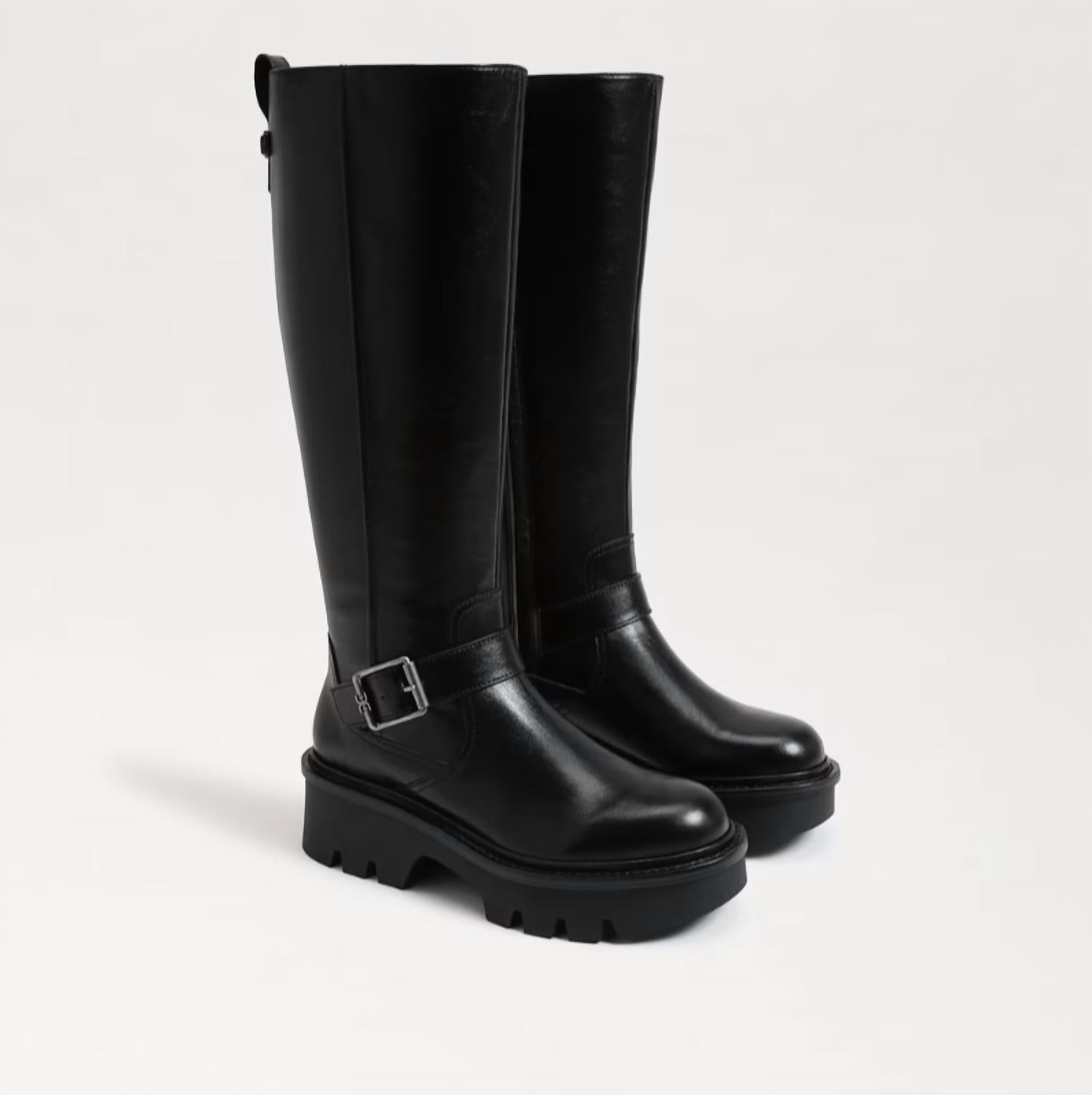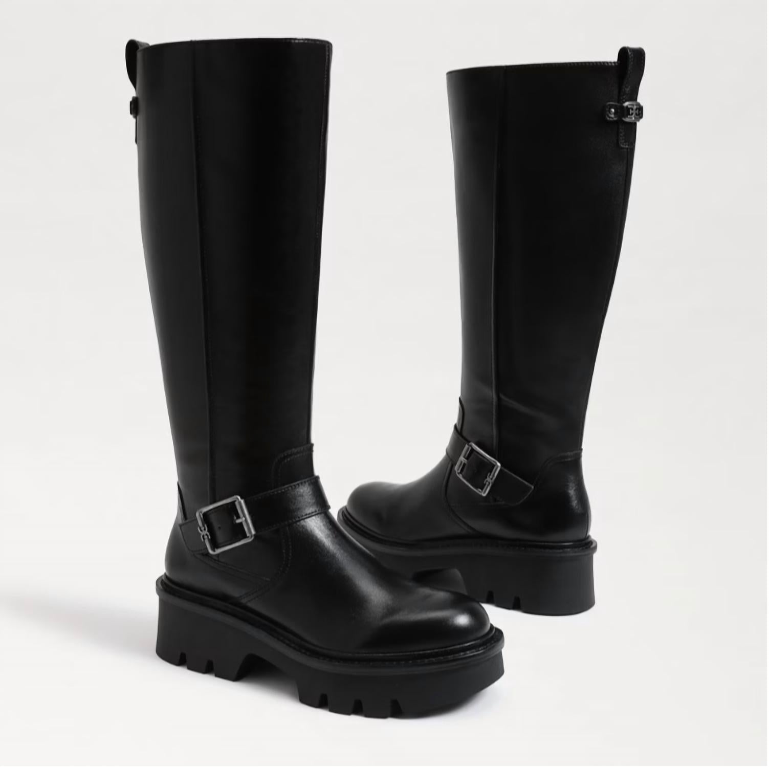 The moto boot trend is here to stay and we especially love this style. Discover the Women's Carter Buckle Detailed Wide Calf Knee High Boots by Sam Edelman, where adventure meets elegance in black leather. These motorcycle boots feature a rounded toe design and a zipper closure for a snug fit. The sturdy .62-inch chunky heel adds both style and comfort, perfect for your journeys. Step confidently this fall and beyond, with a synthetic insole to ensure lasting ease as you embrace the open road.