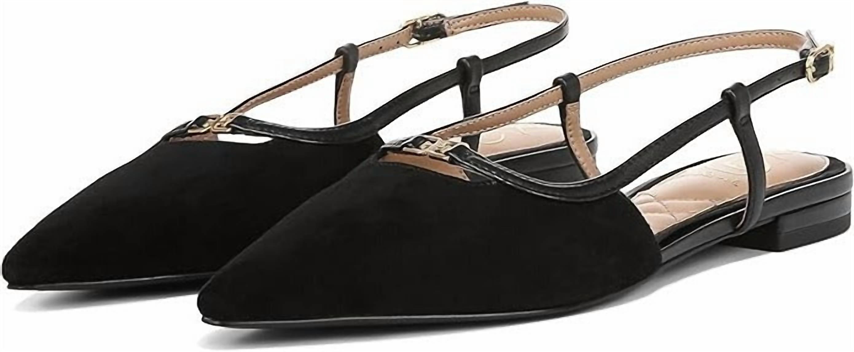 Introducing the Women's Cohen Slingback Pointed Toe Flat by Sam Edelman, a chic addition to your fall footwear collection in timeless Black Suede. Crafted with a blend of leather and synthetic materials, these flats feature a distinctive pointed toe and a convenient buckle closure. The heel height is a subtle 0.62 inches, adding just the right amount of elevation while maintaining comfort. Ideal for vacation and workwear alike, this flat pairs beautifully with flowing fabrics and wider silhouettes.