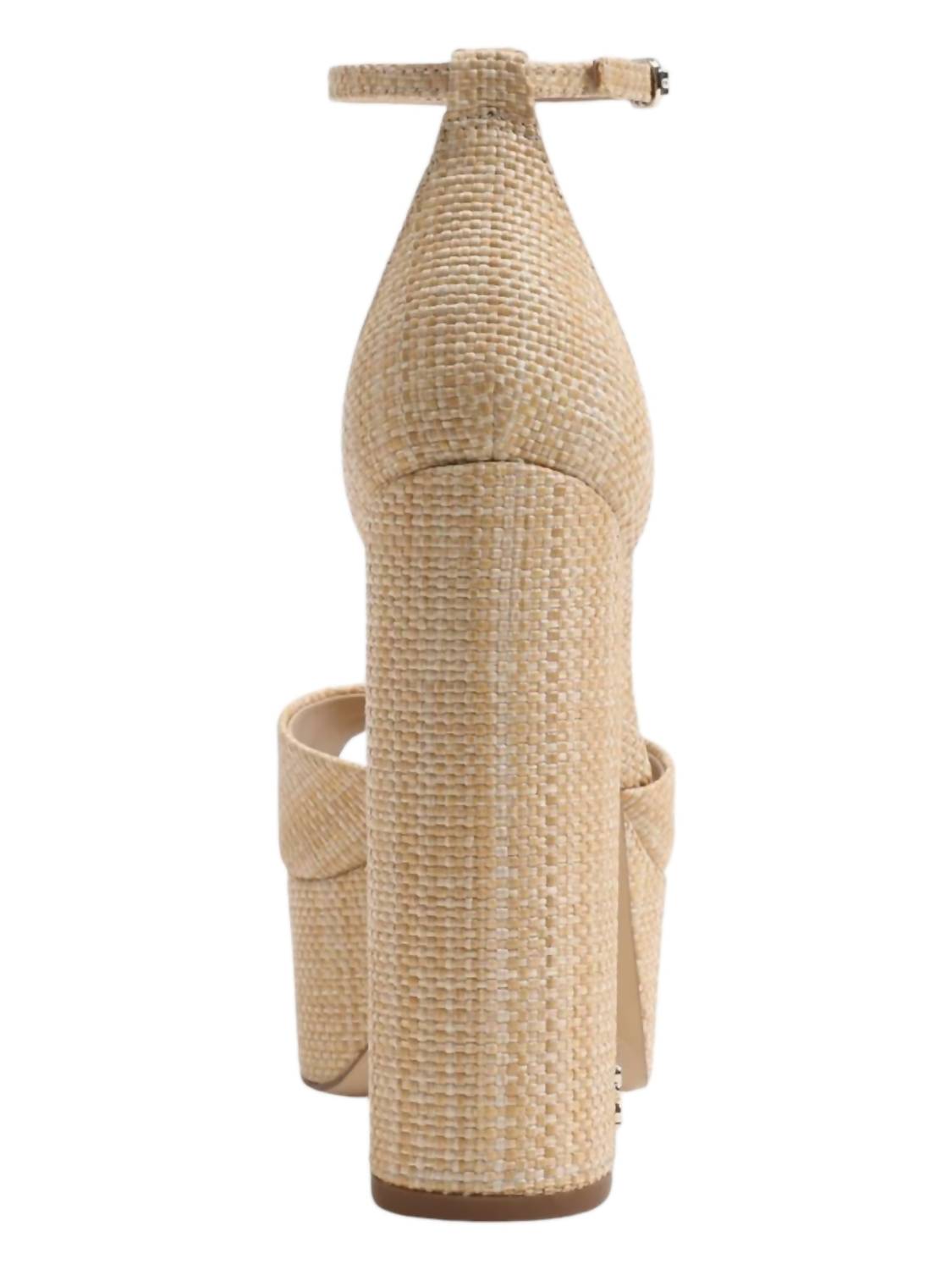Flowy dresses, cropped pants, and even jumpsuits... this sandal works with them all! Metallic platform heel. Peep toe. Stabilizing ankle strap with buckle closure. Heel height: 4.3 inches. Platform height: 2 inches. Leather, synthetic, fabric. Synthetic insole.