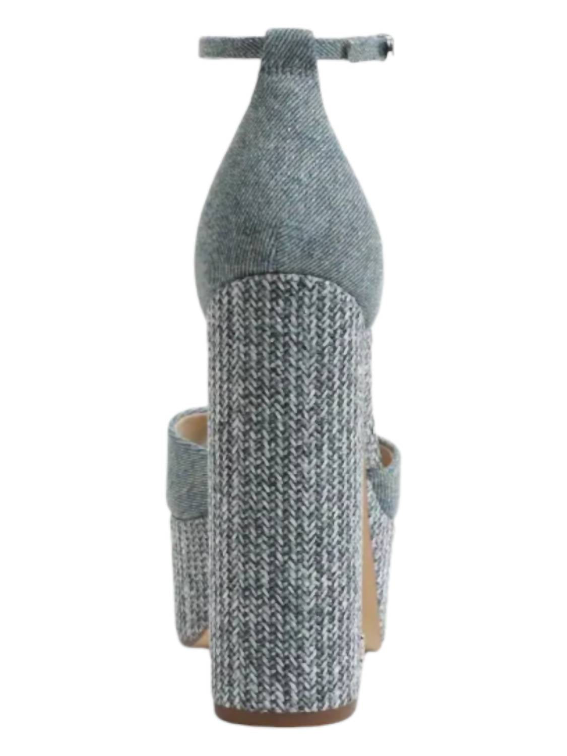 This sandal will take you from brunch to dinner and everything in between. Metallic platform heel. Peep toe. Stabilizing ankle strap with buckle closure. Heel height: 4.3 inches. Platform height: 2 inches. Leather, synthetic, fabric. Synthetic insole.