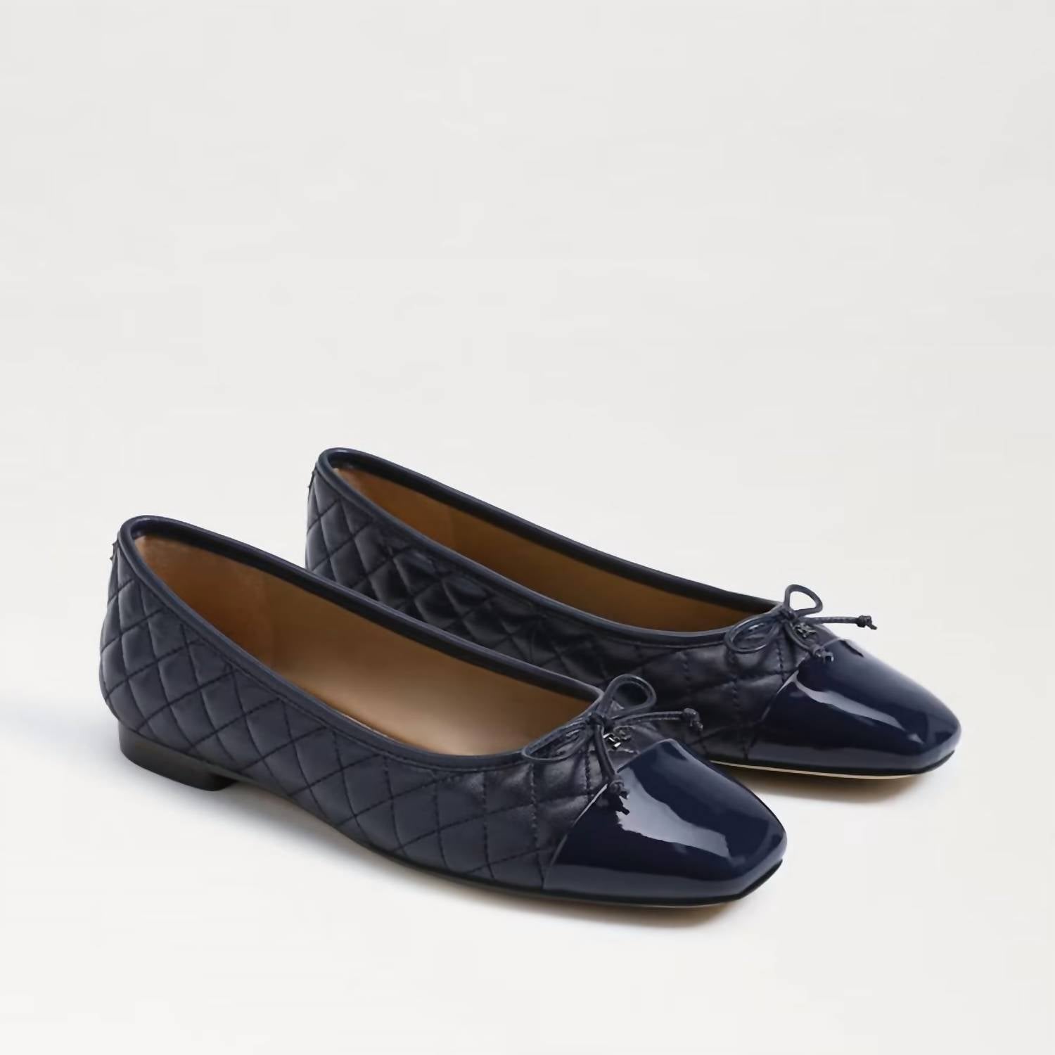 A classic loafer that is both comfortable and polished. Discover the elegance of the Women's Marilyn Ballet Flat by Sam Edelman, crafted with a quilted leather upper for a sophisticated touch. This navy flat features a chic squared cap toe and a delicate bow adorned with the SE logo. Designed with a comfortable flat heel measuring 0.37 inches, these slip-on shoes are perfect for stylish strolls. Embrace the timeless charm of these flats, ideal for any occasion.