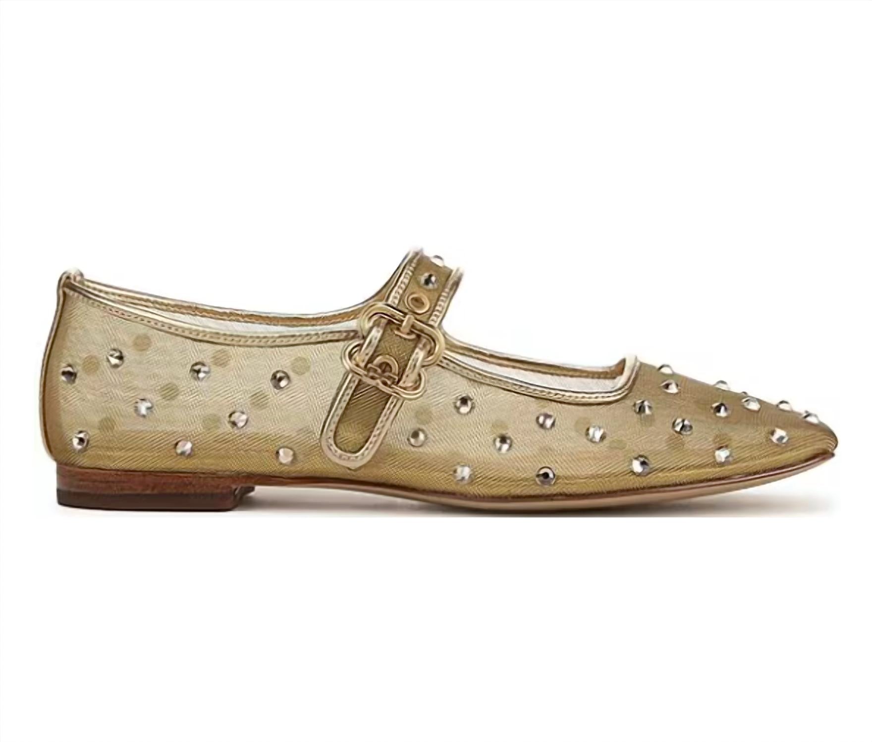Loafers so versatile you can wear them with just about anything. Touch of sparkle in a stunning gold hue. Delicate fabric shoe features a square toe and is adorned with rhinestone details. Complemented by a comfortable 0.37-inch flat heel. Includes a convenient buckle closure and a leather insole for added comfort. Perfect for women seeking both style and comfort.