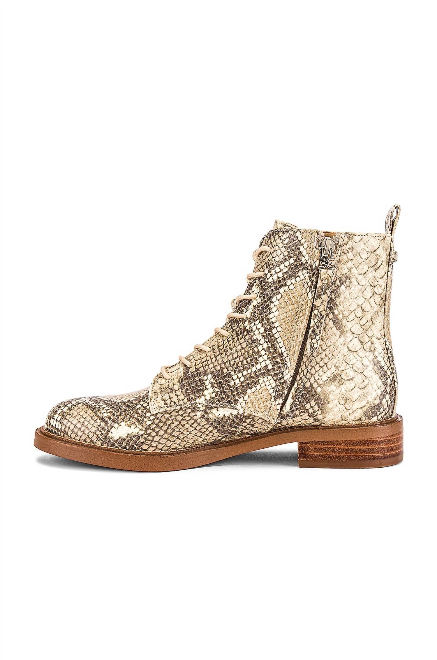 The moto boot trend is here to stay and we especially love this style. Step into effortless style with the Women's Nina Combat Boot by Sam Edelman, crafted in sophisticated eggshell-hued leather. Featuring a synthetic sole and a comfortable 1.25" heel, these boots boast a sleek ankle-length shaft with a unique croc-embossed finish at the back. The lace-up front and convenient side zipper closure offer both practicality and style. Ideal for fall travels, they promise comfort with a synthetic insole and a round toe design.