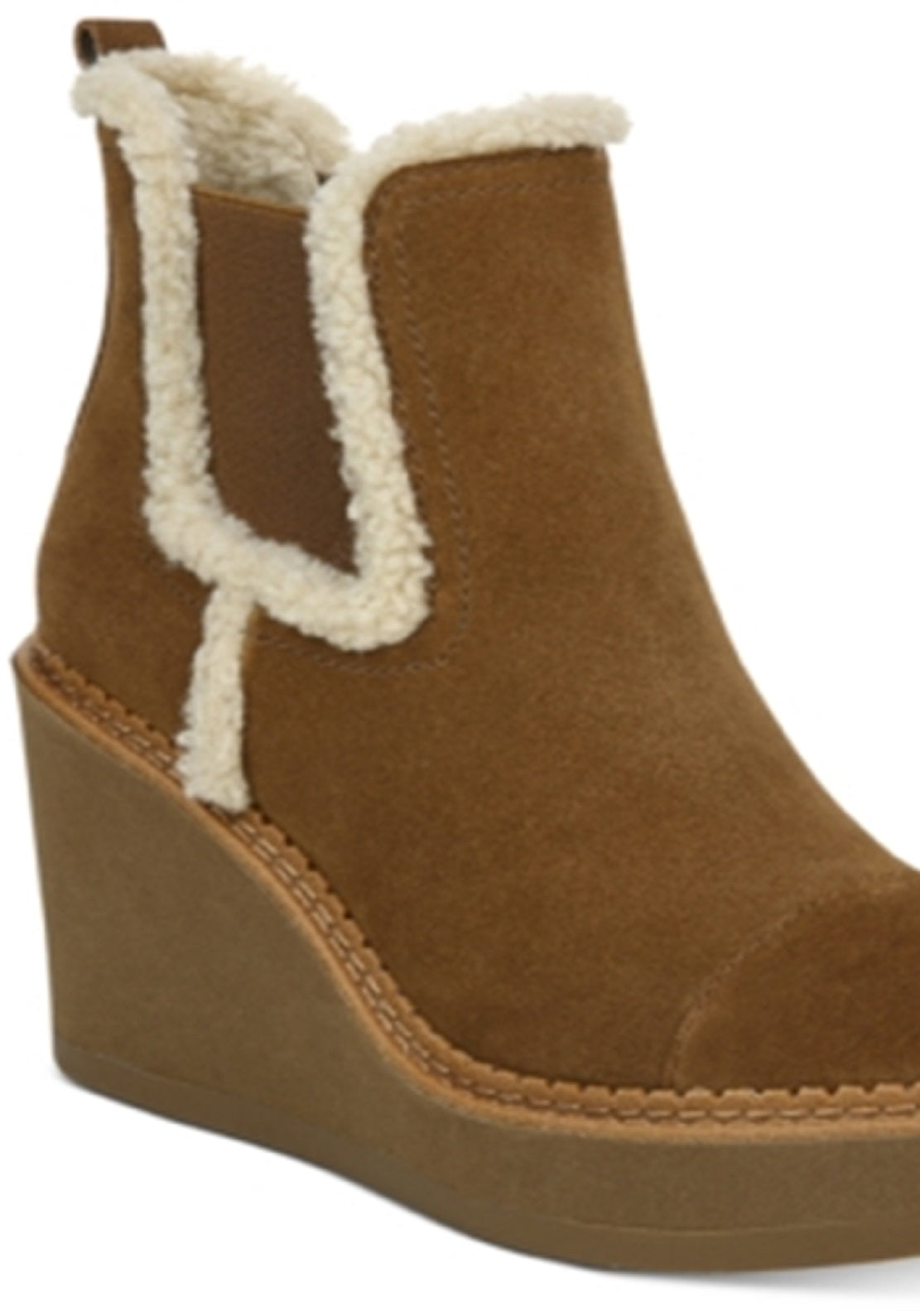 Fluffy faux-shearling trim for toasty texture| side gores for slip-on ease and chunky wedges for comfortable height make Sam Edelman's Reagan booties a go-to cold-weather look.| 3-1/8 wedge heel; 1 platform| Round-toe slip-on platform wedge booties with goring at sides| Faux-shearling trim; pull-tab at back| Cushioned insole for added comfort| Suede/polyester faux-shearling upper; manmade lining; manmade sole