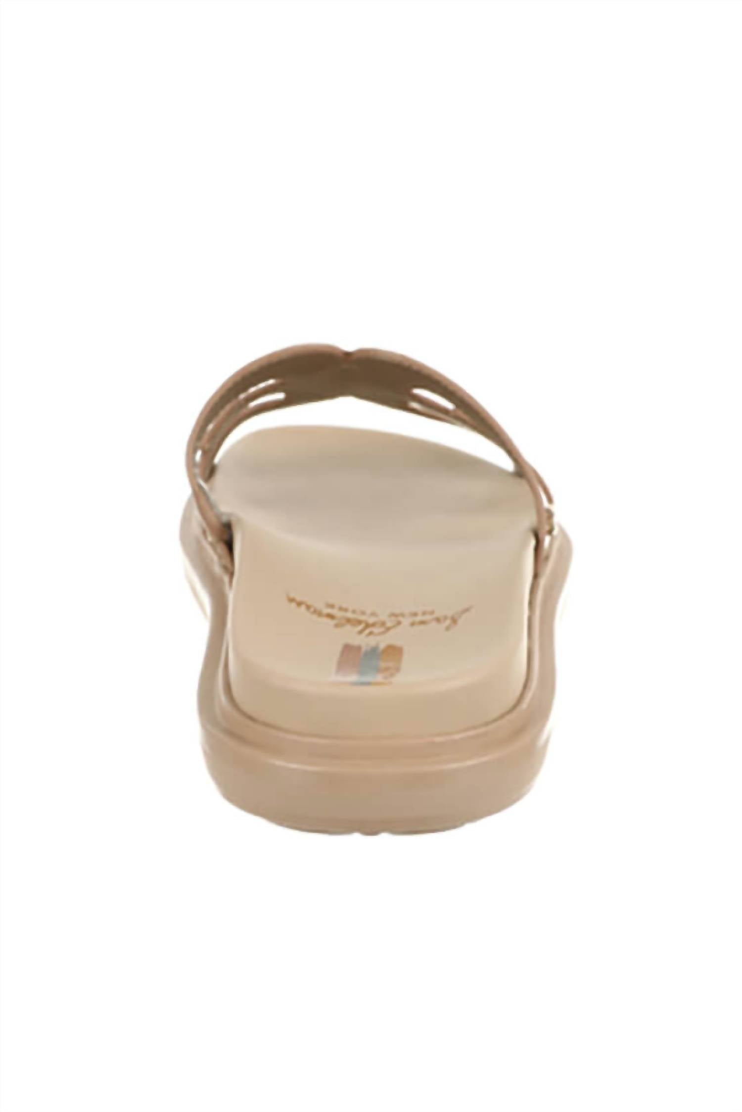Flowy dresses, cropped pants, and even jumpsuits... this sandal works with them all! Step into comfort and style with the Women's Valeri Slide Sandal by Sam Edelman, crafted in sophisticated Almond Patent leather. These slip-on sandals feature an open toe and flat heel design, with a platform height of 0.5 inches providing just the right lift for every step. Closure: Slip-on. Material: Leather.