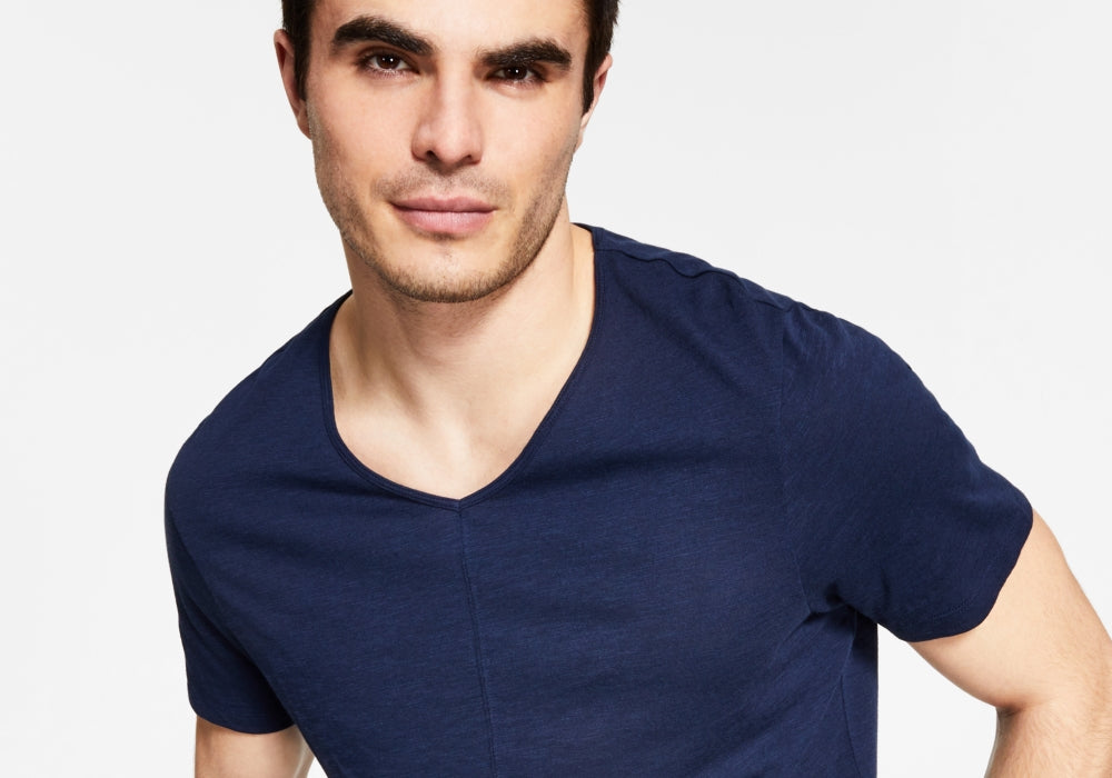 Stylish seaming detail down the front of this soft V-neck T-shirt from INC International Concepts® lends a contemporary twist to a classic look. | Approx. 28 long| Regular fit | V-neck| Seaming detail at center front | | Cotton/polyester/rayon