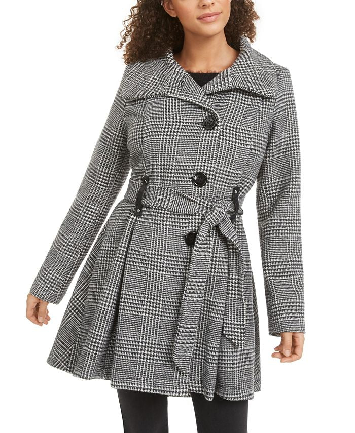 deliver on drama| all year round. madden girl's chic skirted coat flatters your curves| while cute buttons and a chunky tie pull it all together. | approx. length; 36-1/2 from center back to hem | wing collar; asymmetrical button closures at front| removable belt