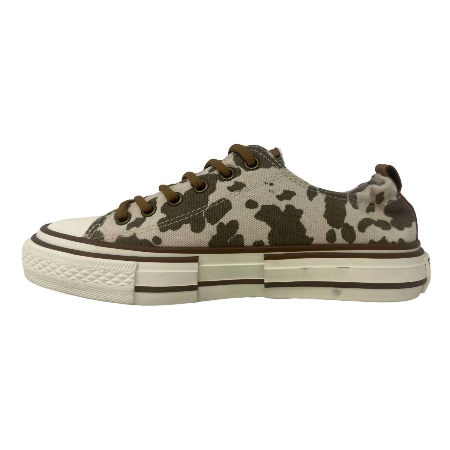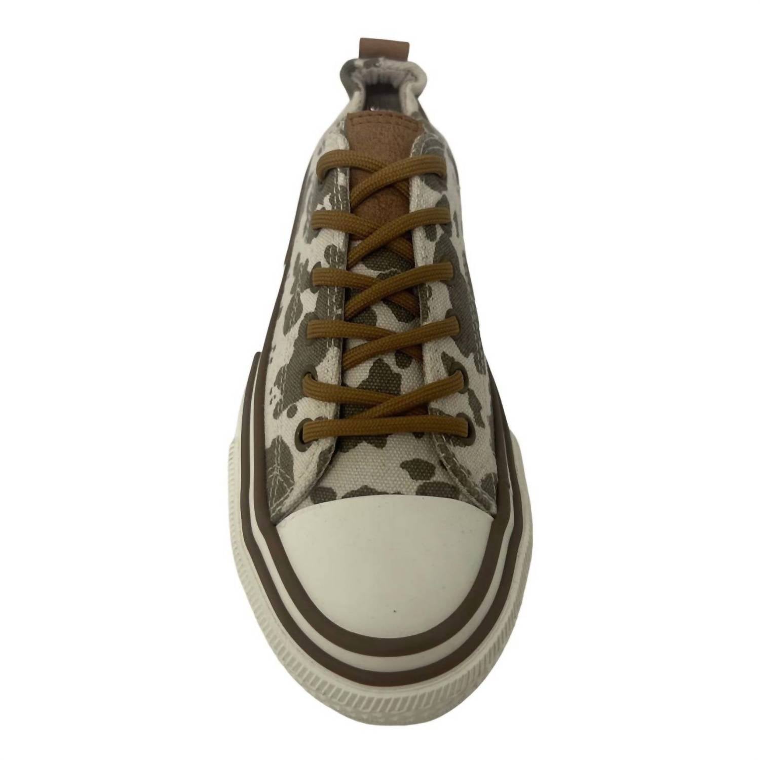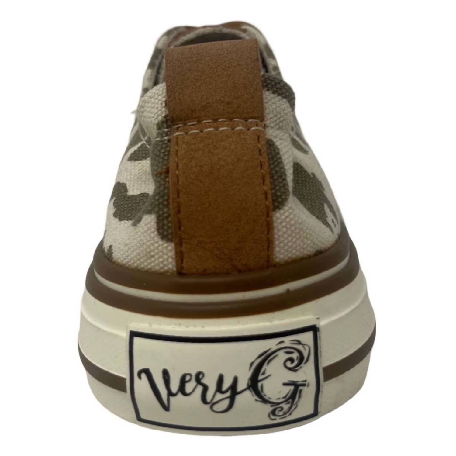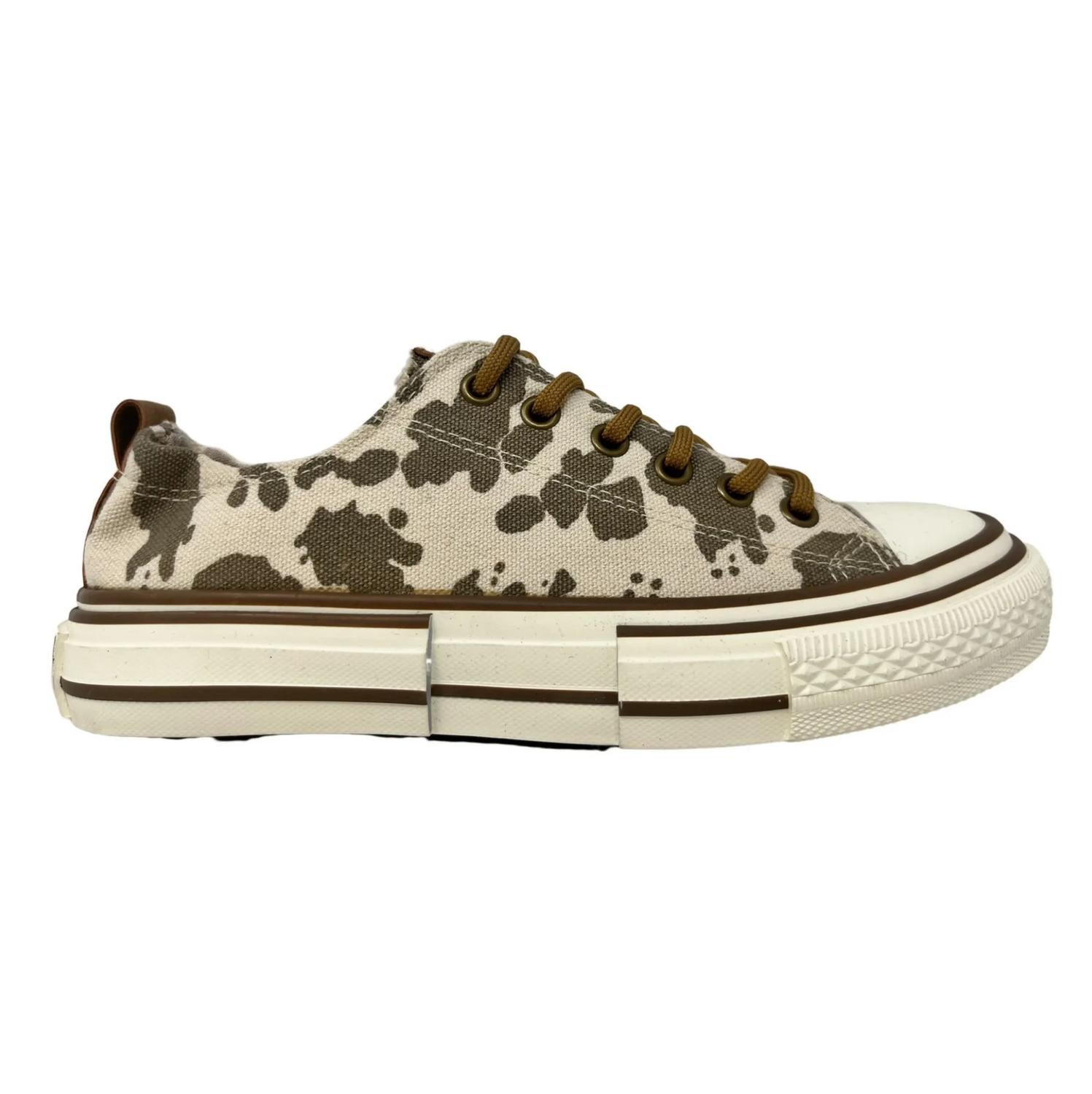 Cute, functional, and comfortable. These sneakers check all the boxes. Step out in style with the Driana 3 Sneaker by Very G, featuring a whimsical taupe cow print that effortlessly elevates any outfit. These sneakers are crafted with a synthetic upper and a durable rubber outsole, ensuring a perfect mix of comfort and style. Designed with a lightly cushioned insole for enhanced support, they feature a tie closure for a secure fit. With their flat heel and round toe, these sneakers provide both functionality and flair for the modern woman.