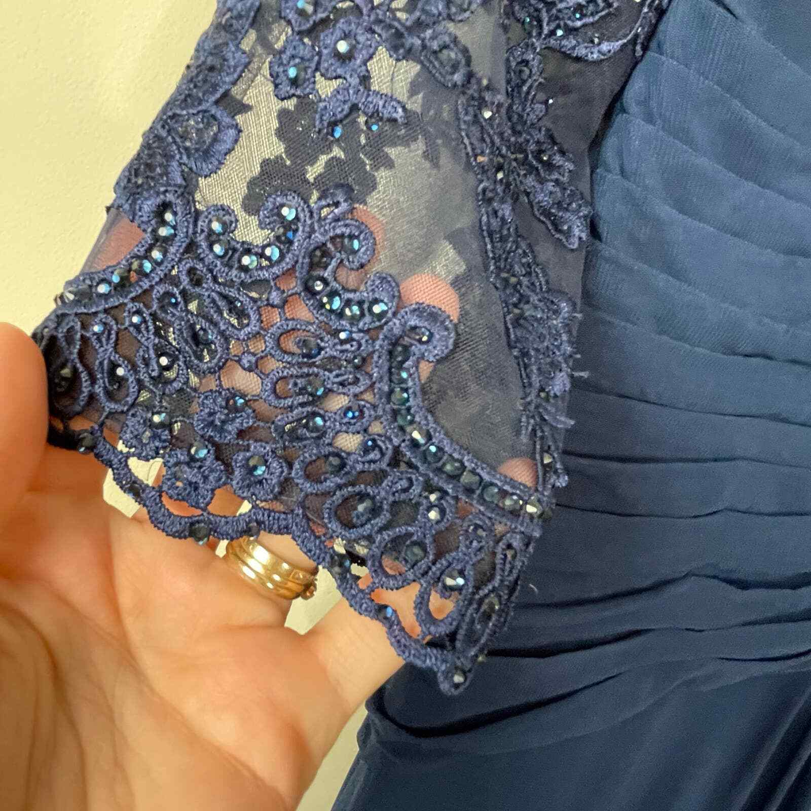 Fitted column silhouette | Ruched twist detail | Elegant navy blue color | Floor-length dress | Size 10 | Sold at Nordstrom | Designed by La Femme | Sleeveless style | Long| flowing skirt | Sophisticated evening wear