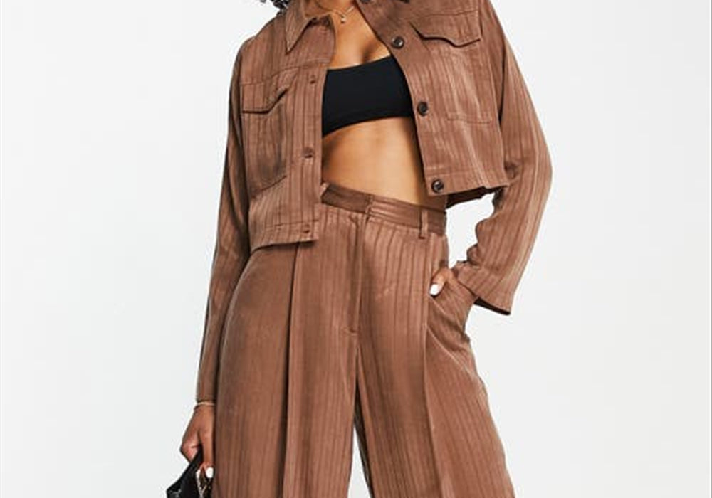 High-Rise Fit | Wide-Leg Design | Stripe Pattern | Pleated Detailing | Lightweight Material | Comfortable Elastic Waistband | Two Side Pockets | Size 10 US | Authentic Topshop Product | Sold at Nordstrom | Elegant Brown Color