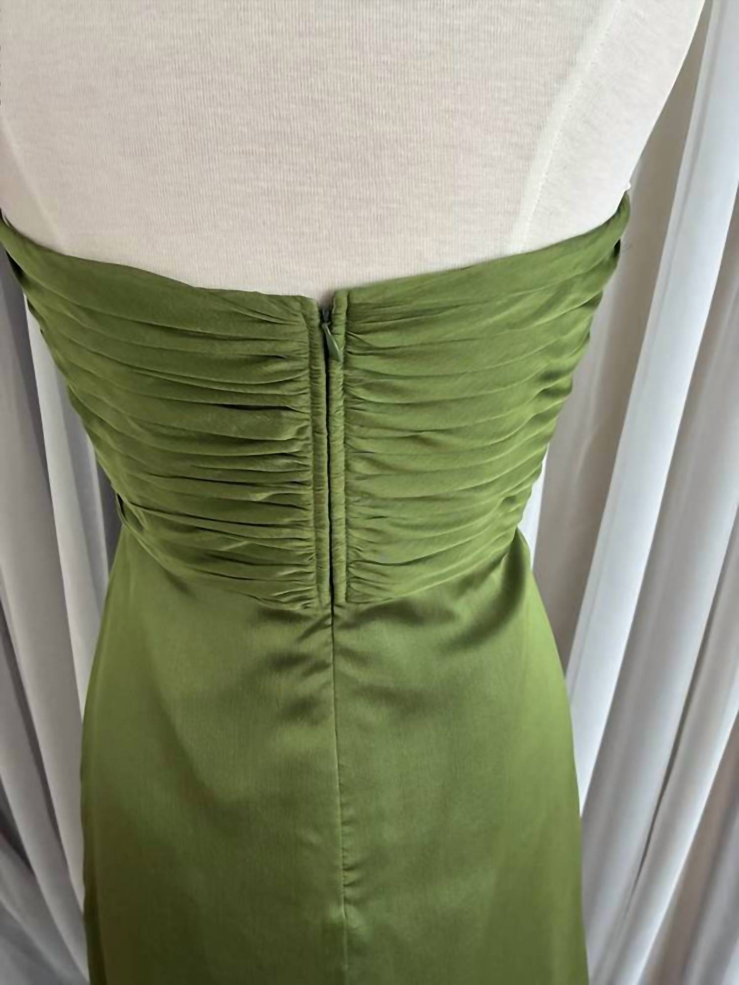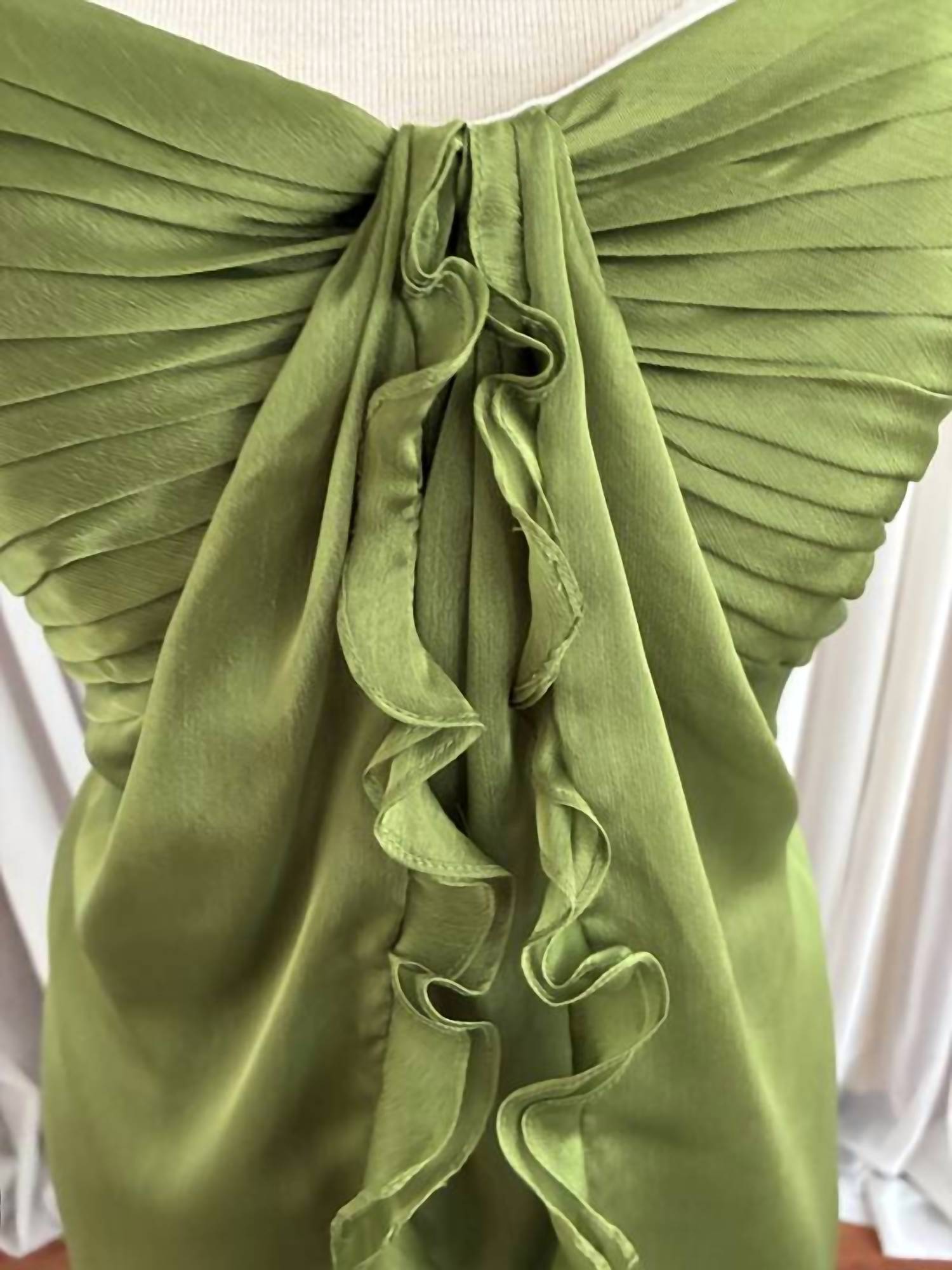 This Bari Jay women's formal evening gown is a stunning strapless dress in a vibrant kiwi color. The bodice features an elegant ruched design that gathers at the center, flowing into cascading vertical ruffles down the front of the skirt. Crafted from an iridescent chiffon fabric, the gown possesses a subtle sheen that catches the light beautifully. The dress has a long, flowing silhouette, making it an ideal choice for formal events and special occasions. The overall design combines classic elegance with playful ruffle detailing.
