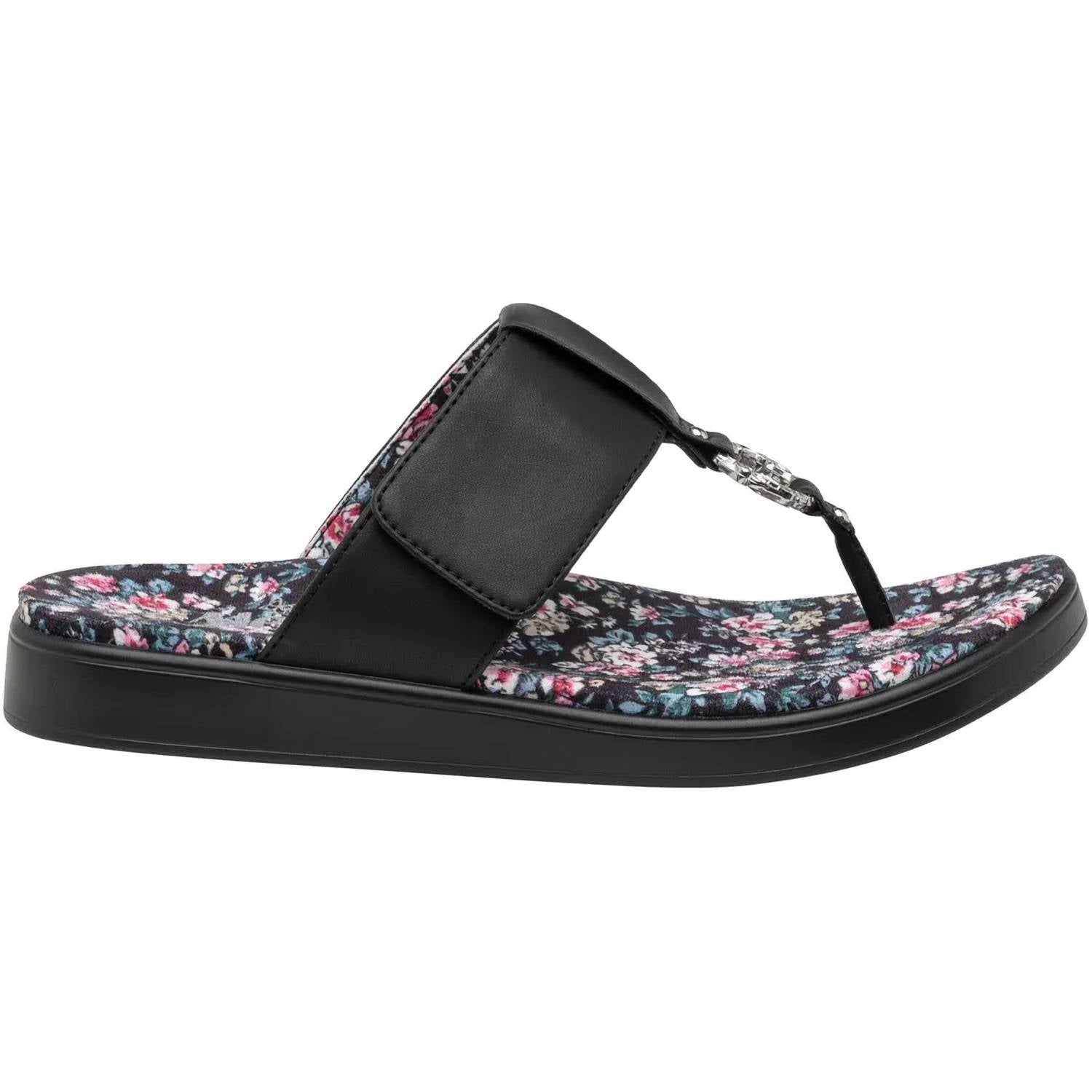 Flowy dresses, cropped pants, and even jumpsuits... this sandal works with them all! The Enchanting is featured with easy-care vegan leather. It's dressed up with a decorative ring ornament that connects to the adjustable hook-and-loop instep strap. Completing the design is a printed microsuede lined footbed and featherweight slip-resistant comfort flat outsole for all-day walkability.