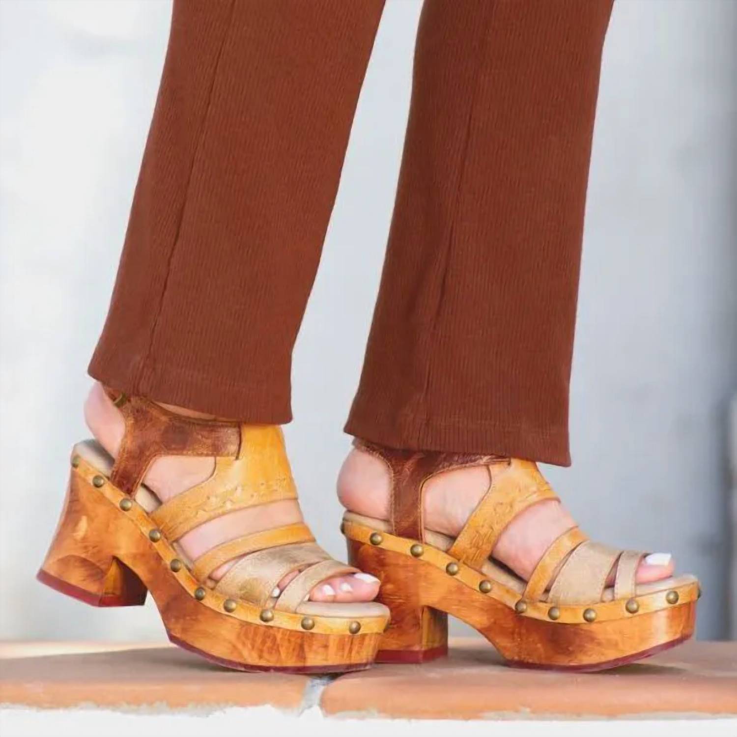 Stunning boho chic option perfect for holiday parties this fall. Crafted from chrome and formaldehyde-free, vegetable-tanned tri-color leather, feature an adjustable sling-back buckle, open toe, and metal stud accents for a bold look. Handmade and hand-finished in Mexico. Rest on a sustainably sourced wood platform with a high 3.5-inch block heel and 1.5-inch platform. Enjoy comfort with a cushioned natural latex insole and a red rubber outsole.
