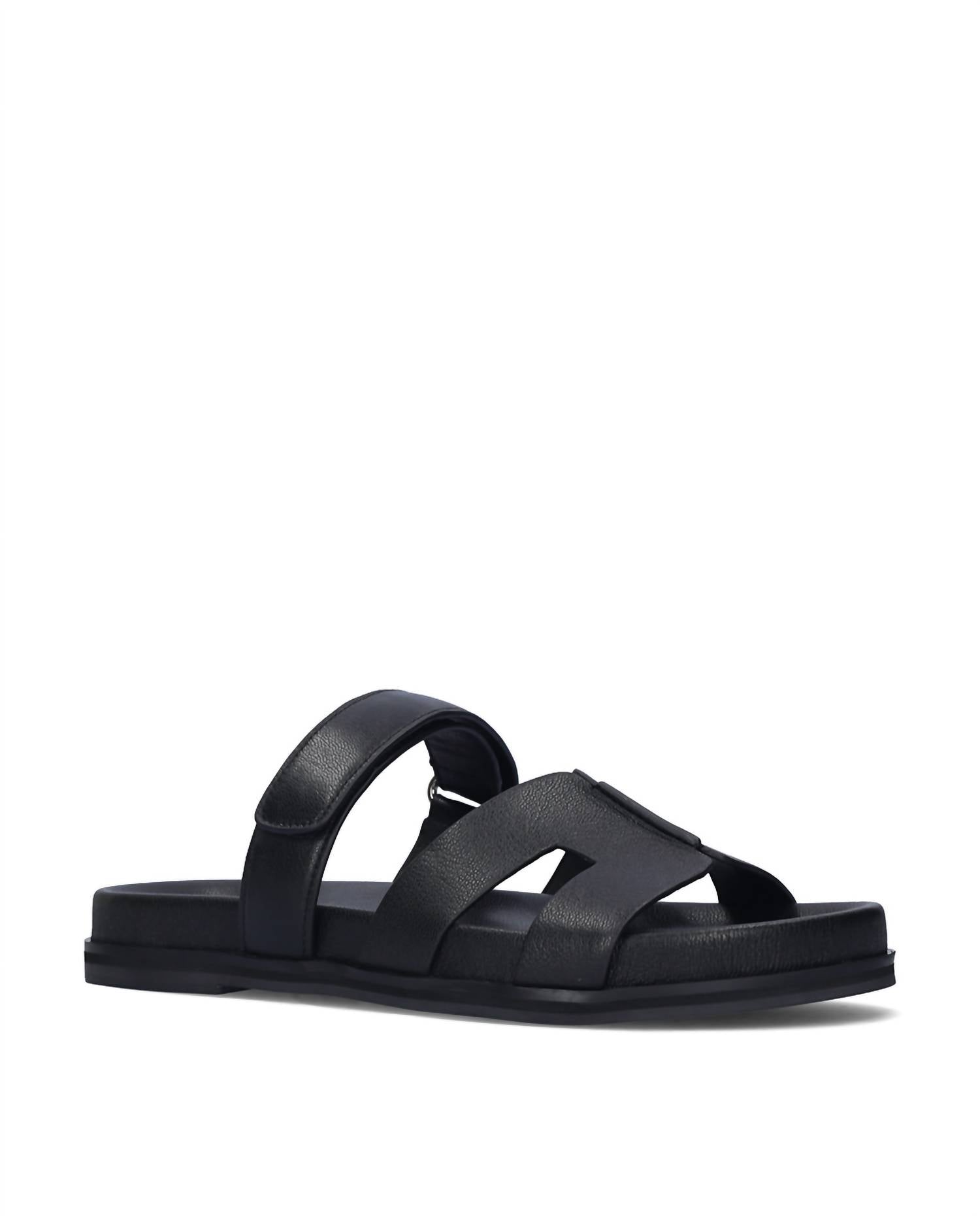 These black sandals feature an elegant open toe and a flat heel with a comfortable height of 1 inch, perfect for everyday wear. Crafted with a leather upper and insole, and finished with a durable rubber sole, these imported sandals offer both style and functionality.