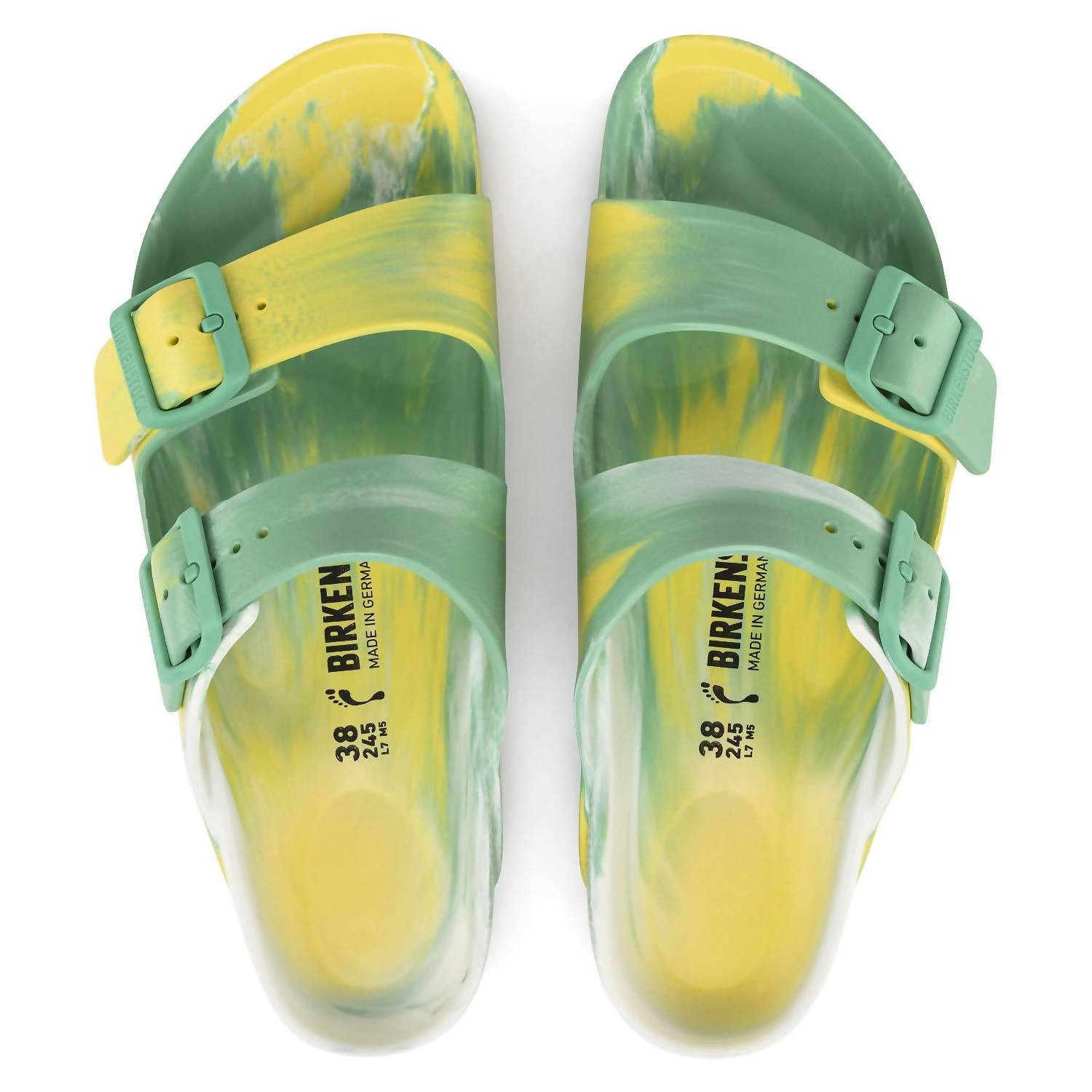 Embrace vibrant style with the BIRKENSTOCK Women's Arizona EVA Sandals in Multi Color Jade/Vibrant Yellow. Crafted entirely from high-quality, odor-neutral EVA, these sandals are ultra lightweight, water-resistant, and skin-friendly, providing the signature comfort BIRKENSTOCK is known for. Made in Germany, the sandals feature an anatomically shaped footbed for unparalleled support. Easy to clean and unique in design, no two pairs boast the same artistic swirl of colors.