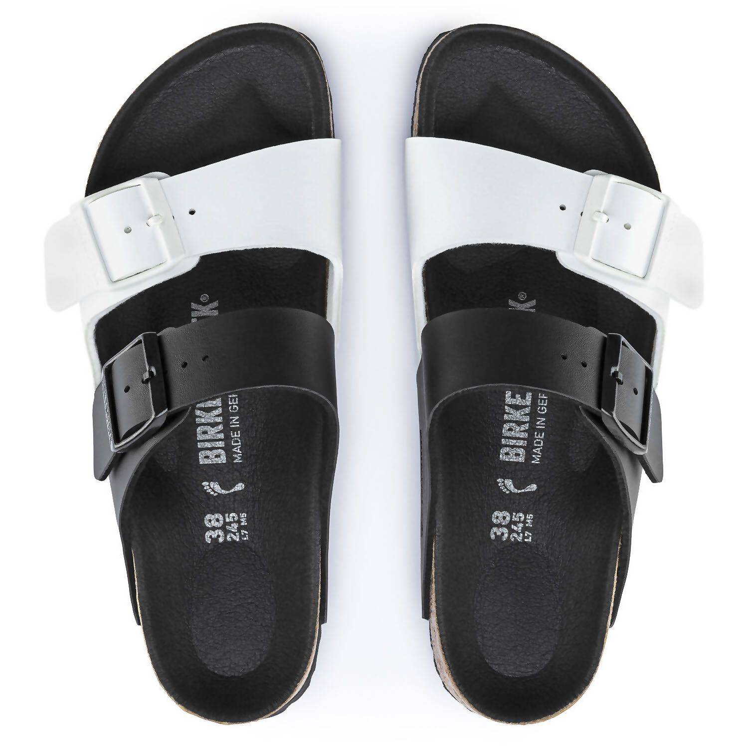 Flowy dresses, cropped pants, and even jumpsuits... this sandal works with them all! Step into warm-weather style with the Women's Arizona Split Sandals by BIRKENSTOCK, expertly crafted in Leather uppers. These sandals boast a Dri-Lex® socklining for superior moisture management and a shock-absorbing foam midsole providing all-day comfort. The design is further enhanced by a rubber outsole with tread for shock absorption and traction, complemented by a beveled heel for added stability. Heel height measures 2.25 inches, ideal for streetwear trends and perfect summer outings, available in chic Black White.