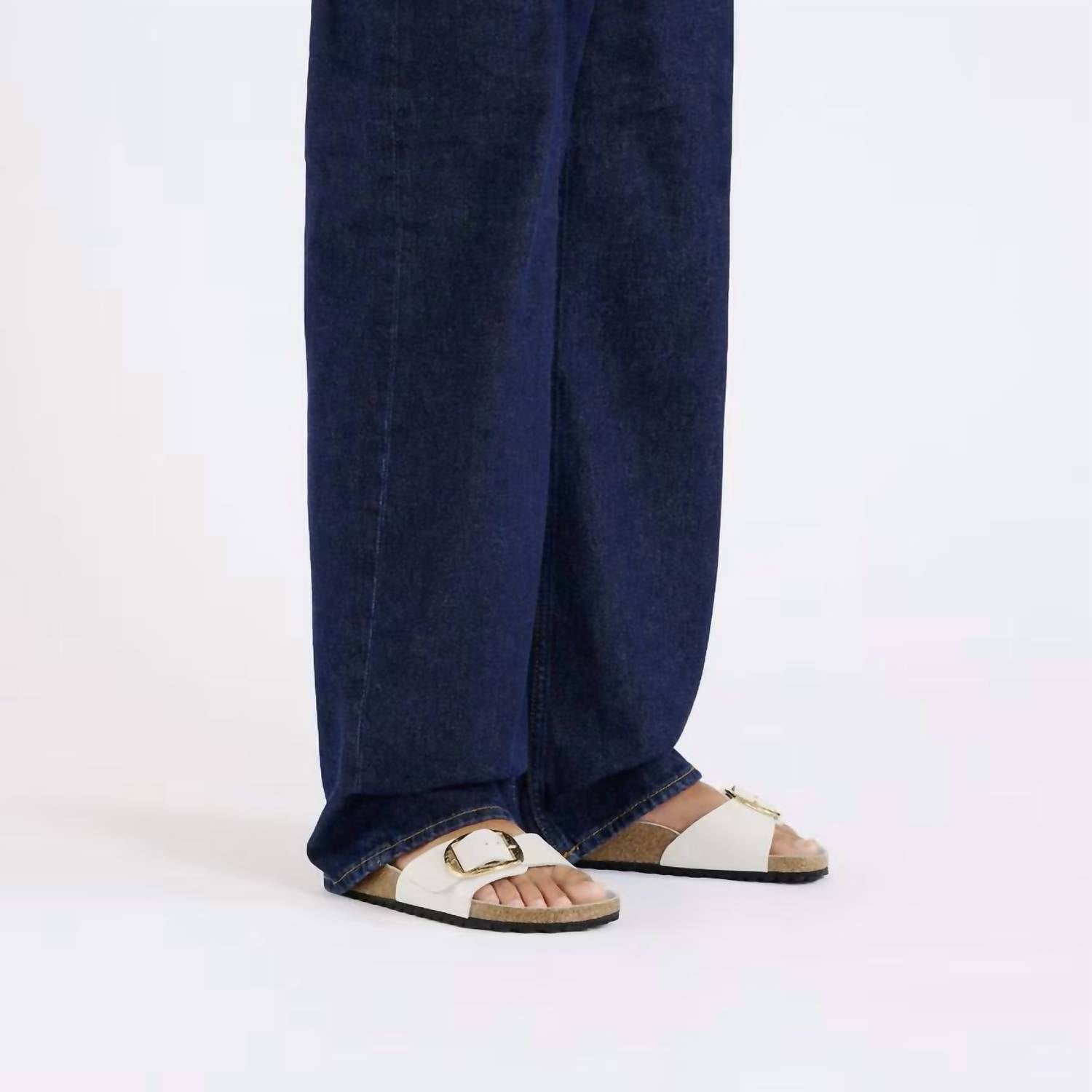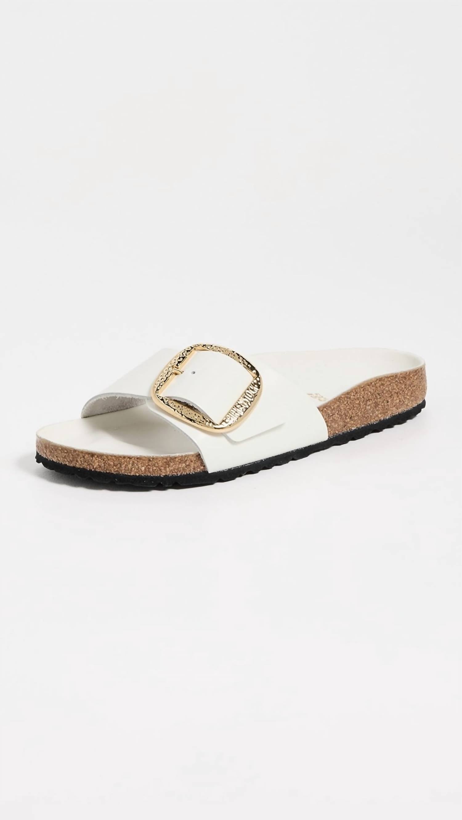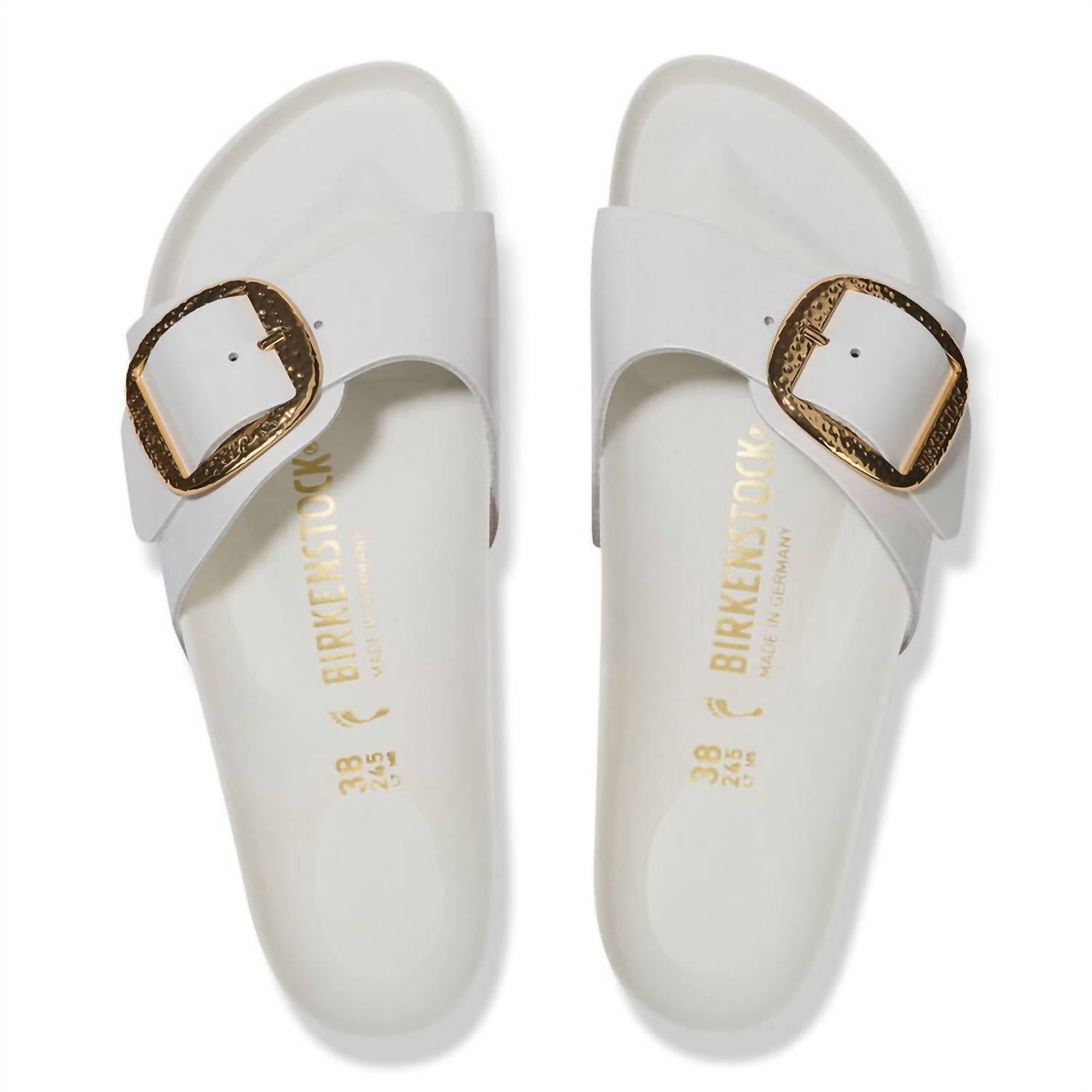 Flowy dresses, cropped pants, and even jumpsuits... this sandal works with them all! Introducing the Women's Madrid Hammered Big Buckle Narrow Sandal by BIRKENSTOCK in High Shine Antique White, designed for those who appreciate quiet luxury. Crafted with a natural leather with a High Shine coating, it features a flexible EVA sole and an open toe with a flat heel, making it perfect for vacation getaways. The sandal includes a contoured cork-latex footbed that offers custom support and a luxuriously smooth leather footbed lining, all secured with an oversized hammered metal pin buckle. Made in Germany, this sandal embodies both style and comfort, ideal for your summer adventures.