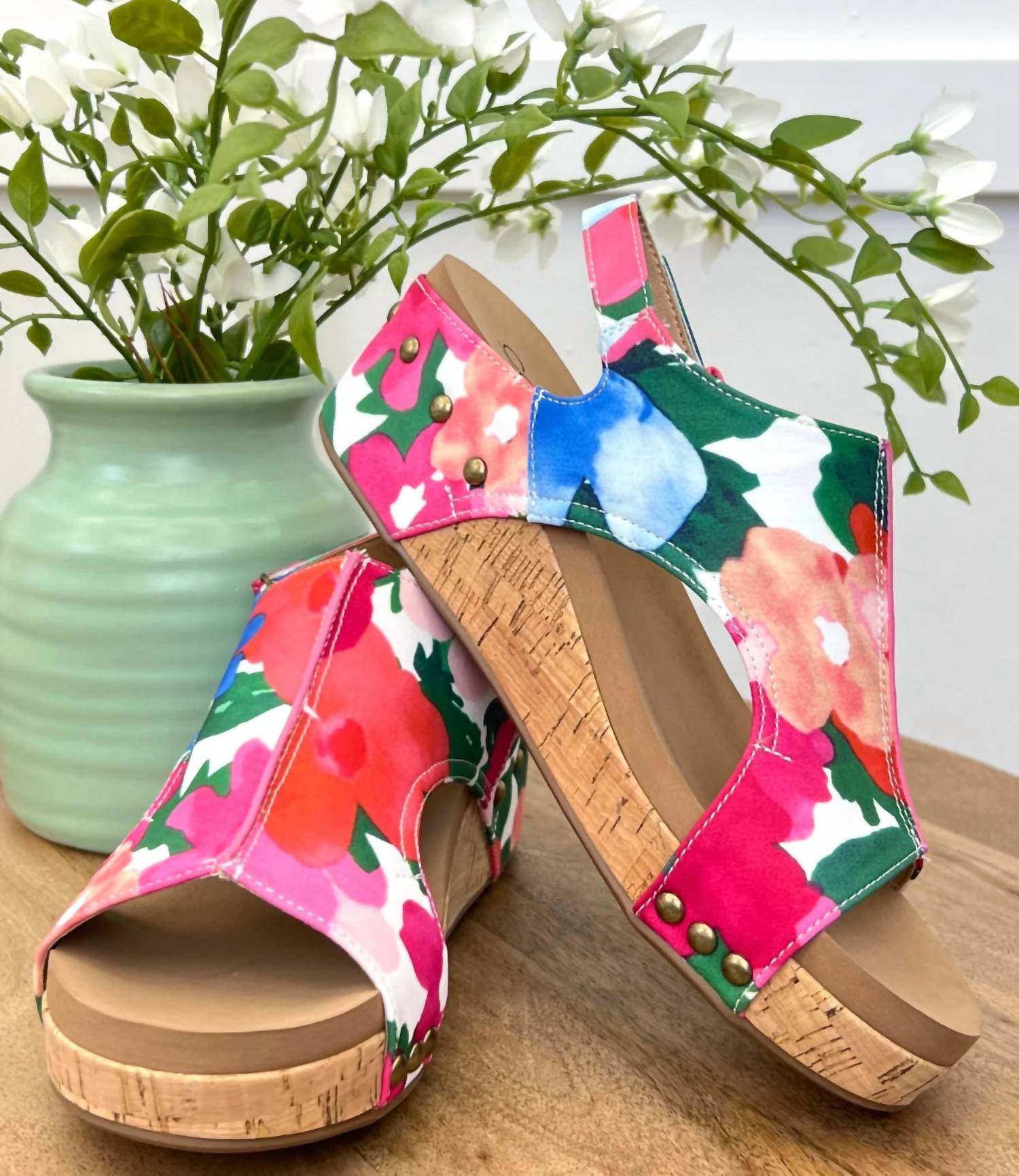 Step into style with Corkys Footwear's Volta II Floral Wedge Sandals, a chic addition to any wardrobe. These sandals boast a 2.5" wedge heel and an open toe design perfect for a touch of 90s fashion flair. Designed with a velcro back strap, they provide a secure fit and comfort suitable for vacations or holiday gatherings like Thanksgiving. Ideal for the spring season, these floral sandals are a must-have for a complete, stylish look.