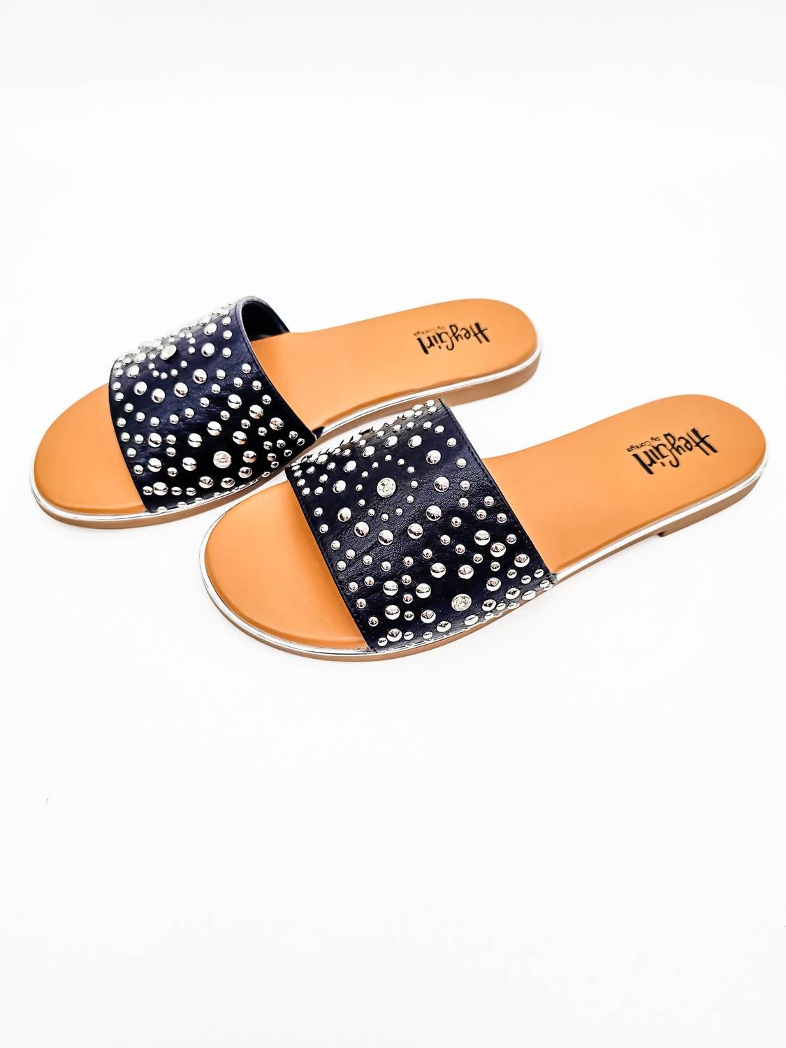 Classicly cute and all-day-wearable. We love this sandal. Step into style with the Women's Bail Money Bling Sandals by Corkys Footwear, offering a chic look with their black faux leather finish and dazzling bling on the band. These flat slip-on sandals feature an open toe design and a comfortable brown footbed with a minimal heel. Ideal for streetwear, they are perfect for a summer vacation or celebrating the 4th of July. Designed to be true to size, consider sizing up for wider feet and down for narrow feet.