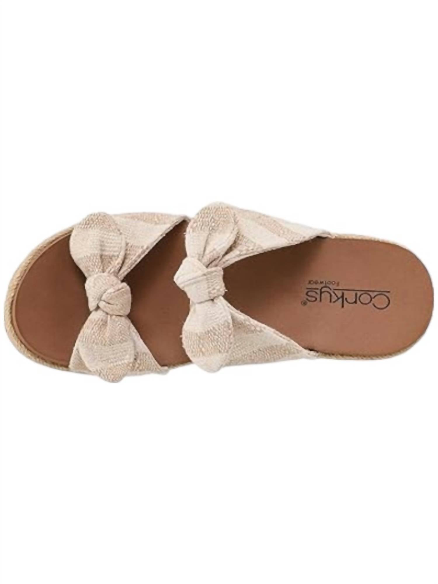 Dresses, denim, shorts... these wedges go with just about anything. Step out in style and comfort with the Women's Tie The Knot Striped Wedge Sandals by Corkys Footwear. Featuring a 2.5-inch cork platform wedge heel, these sandals offer a perfect mix of height, stability, and comfort, ideal for all-day wear. With a synthetic rubber sole and easy slip-on closure, they provide hassle-free wear and durability, complemented by Corkys Soft EVA Memory Foam Insoles. These tan natural sandals with an open-toe design are perfect for spring occasions like holiday parties, making them a sophisticated addition to any ensemble.