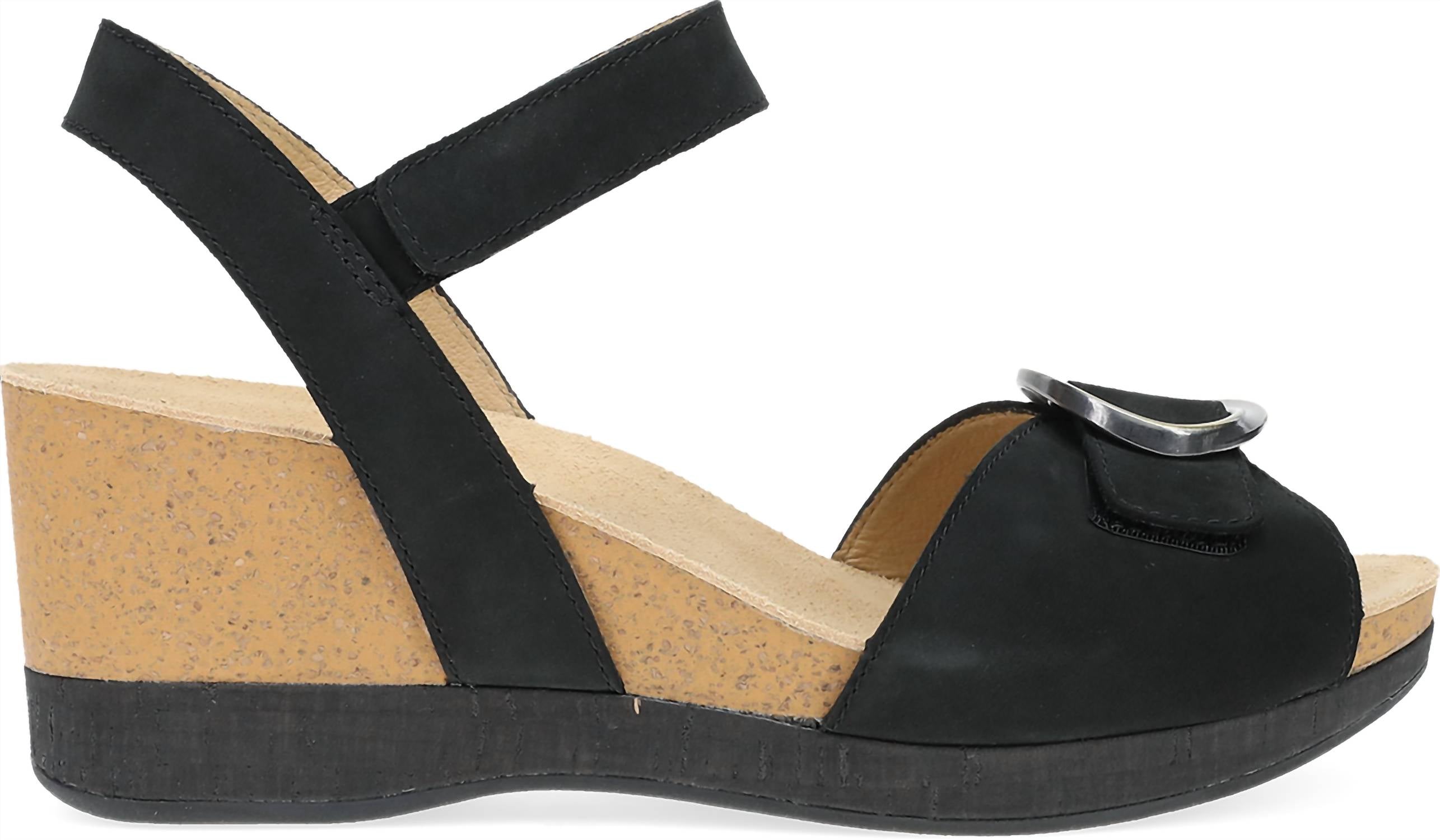 Flowy dresses, cropped pants, and even jumpsuits... this sandal works with them all! Discover the Women's Stella Sandals by Dansko, a perfect blend of style and functionality. Crafted in black high-quality leathers with nubuck treated with 3M Scotchgard™ for stain resistance, these sandals promise both durability and elegance. Featuring a cushioned energy-return PU footbed and a lightweight BPU midsole with an EVA/cork wedge, comfort with every step is guaranteed. The rubber outsole ensures long-lasting wear, while the hook & loop adjustability offers a personalized fit. Enjoy breathable comfort with chrome-free leather lining and suede socklining.