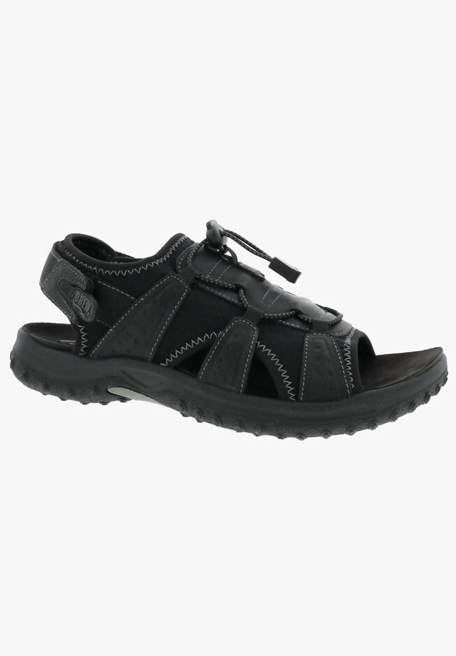 Step into unparalleled comfort with the Men's Waves Sandal by DREW, crafted from a blend of leather and stretch fabric. This versatile sandal in Black Leather Combo features a temperate steel shank, foam-padded tongue and collar, and rubber outsole, designed to accommodate prescribed orthotics with its double depth and removable WalkRight Technology footbed. The adjustable heel strap and bungee lacing ensure a secure, custom fit. Ideal for adults seeking a flat heel and open toe design, this sandal promises both style and support.