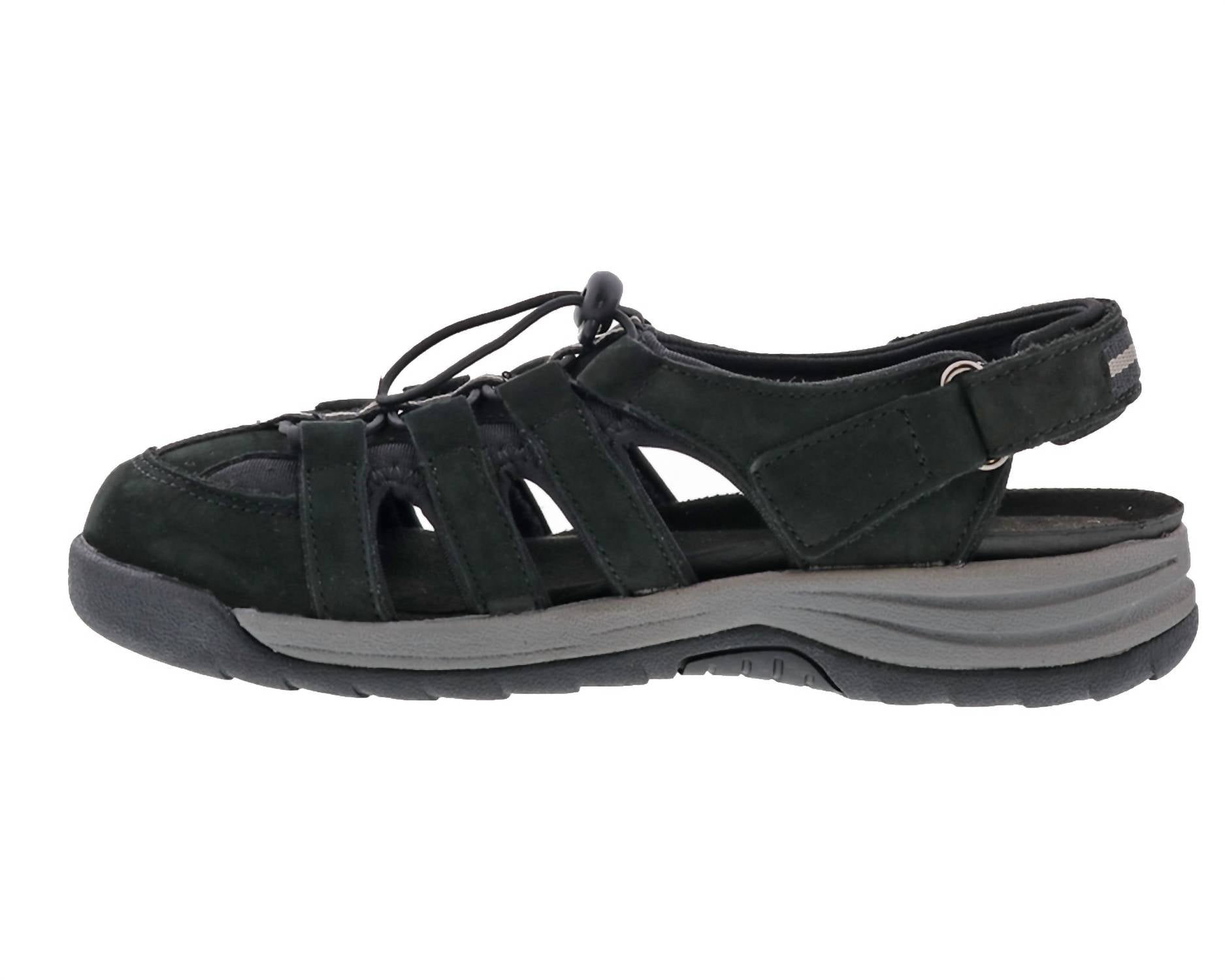 Introducing the Women's Element Sandals by Drew Shoes, crafted from luxurious black nubuck leather for a durable yet stylish look. These sandals feature a soft, stretchable lining and a removable EVA/memory foam footbed with a sueded top cover, providing double depth and accommodating prescribed orthotics for custom comfort. The lightweight rubber outsole with an EVA wedge midsole and a tempered steel shank ensures stability and support, loop adjustable heel strap and quick draw bungee lacing system offer a tailored fit.