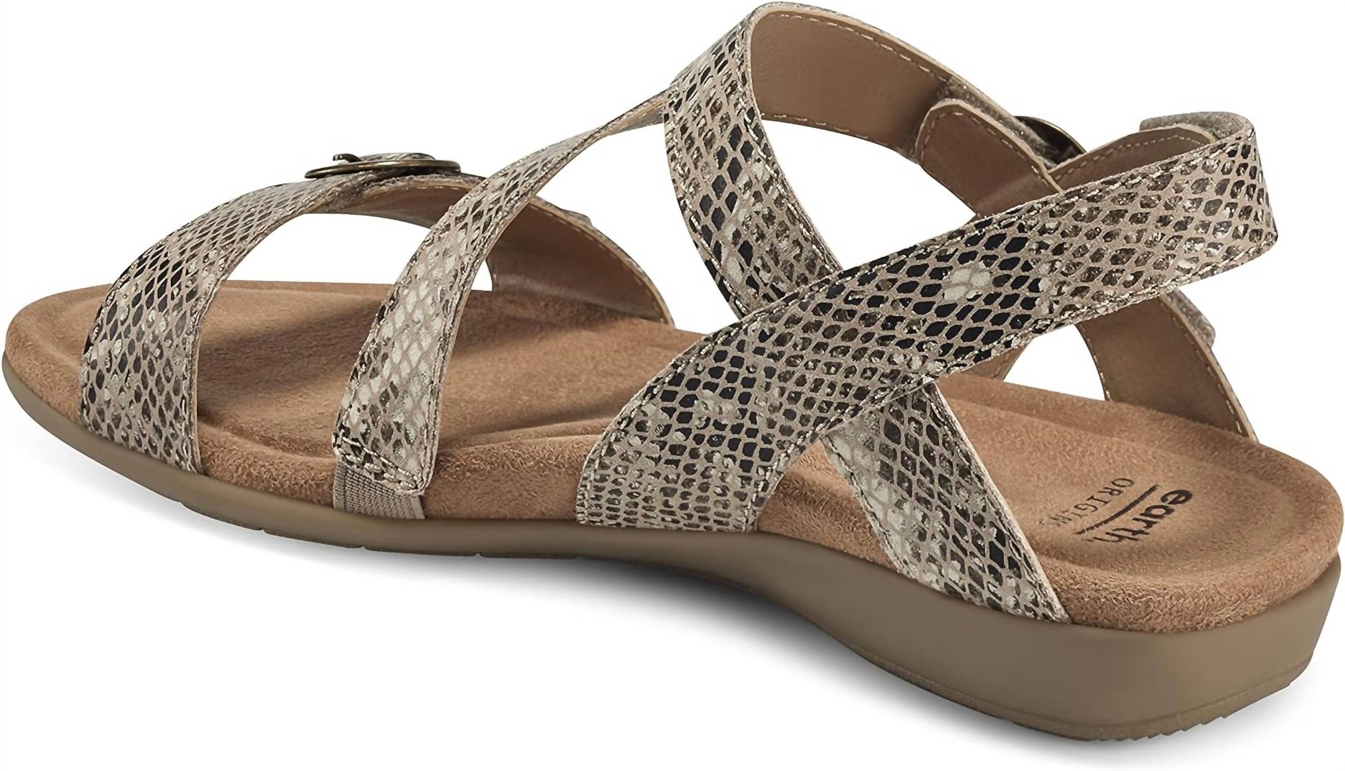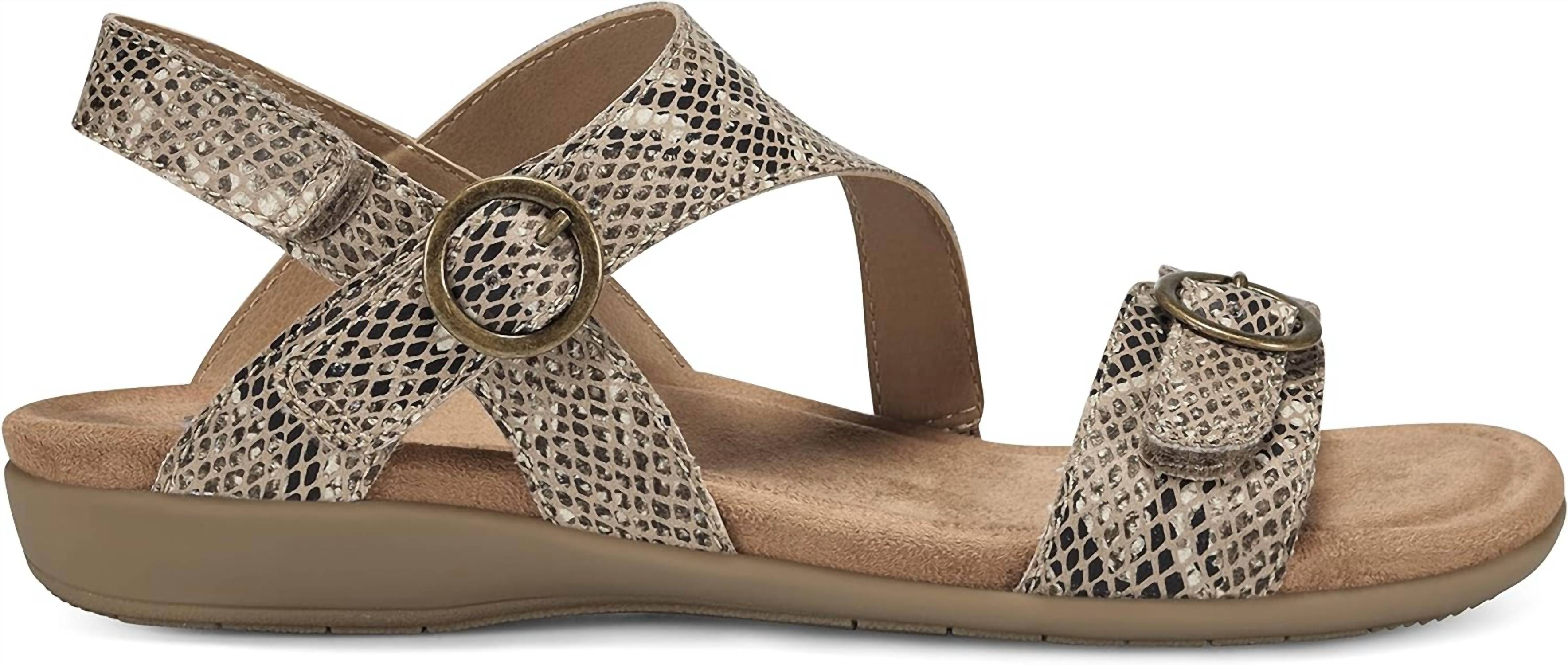 Flowy dresses, cropped pants, and even jumpsuits... this sandal works with them all! Step into the nostalgic charm of the Women’s Beck Strappy Leather Sandals by Earth Origins, featuring premium 100% leather with a classic snake print design. These sandals boast three adjustable straps and a discreet back strap, ensuring the perfect fit and modern comfort. Imported, they include a cushioned memory foam and arch-supporting footbed with a moisture-wicking cover composed of 82% recycled plastic, complemented by a flexible, durable outsole made from partially recycled TPR. For easy maintenance, simply wipe them with a damp cloth.