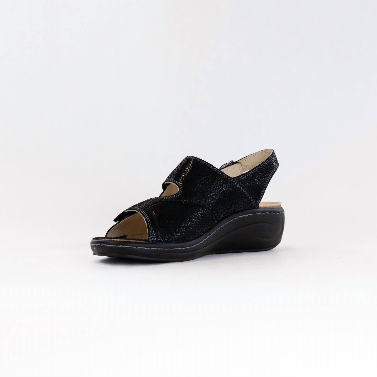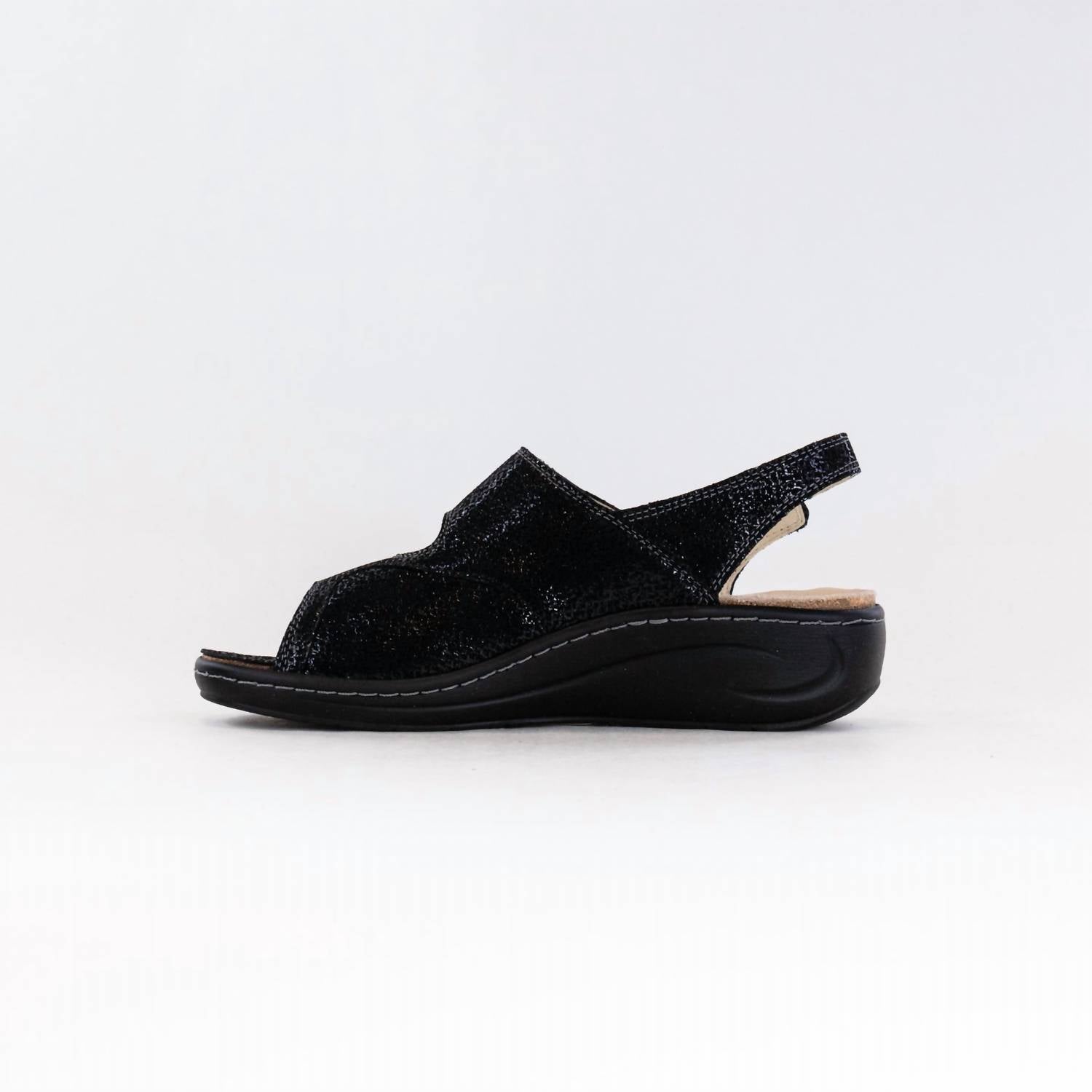This sandal will take you from brunch to dinner and everything in between. Meet the Fidelio Women's Vienna Sandal in Black Float, a stylish companion for your spring and Thanksgiving outings. Crafted from soft leather, this sandal features adjustable hook and loop closures and an ankle buckle strap for a secure fit. The anatomical cork footbed ensures stability and shock absorption, while the air-cushioned midsole and strobel outsole provide excellent traction. Designed especially for those with bunion problems, this minimalist sandal combines functionality with elegance.