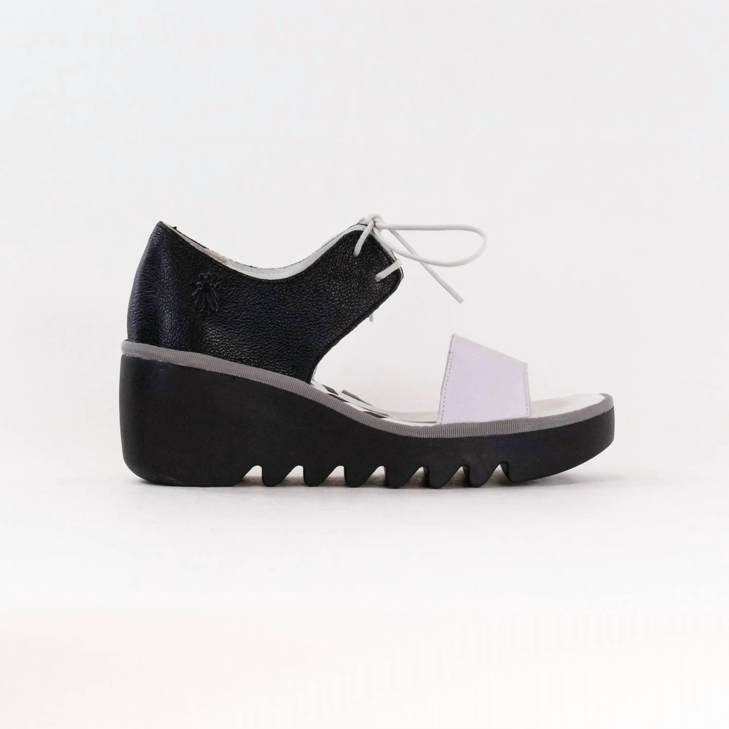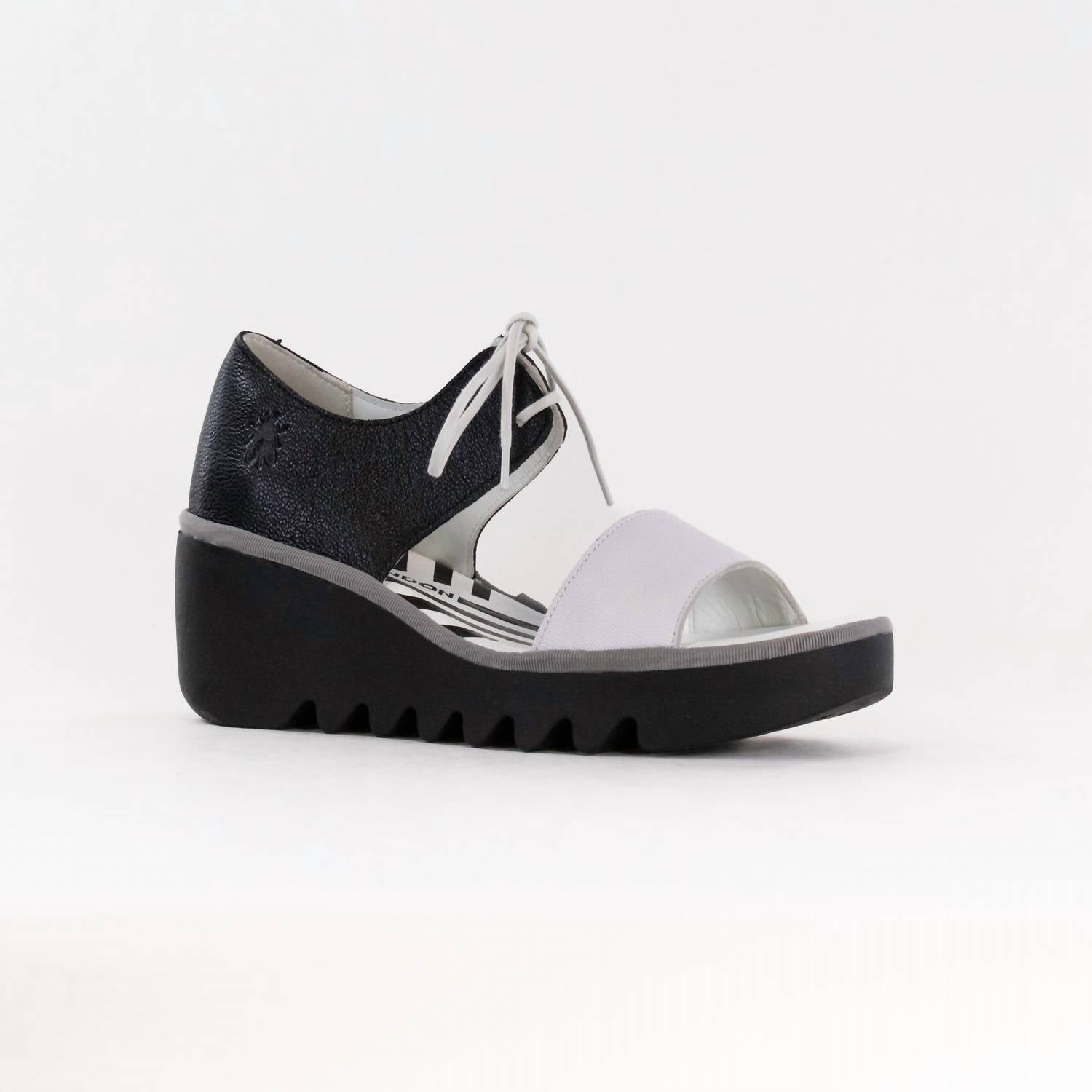 Flowy dresses, cropped pants, and even jumpsuits... this sandal works with them all! Step out in style with the FLY LONDON® Women's Crossover Sandal, a stunning silhouette in white and black. These fashion-forward sandals feature an open toe design and a comfortable wedge heel with a height of 3 inches, ensuring both elegance and ease with every step. Built from a luxurious leather upper and complemented by a leather lining and footbed, these sandals boast a sturdy rubber outsole for added durability. Proudly made in Portugal and equipped with an adjustable lace closure, this chic pair offers unmatched comfort and the perfect fit.
