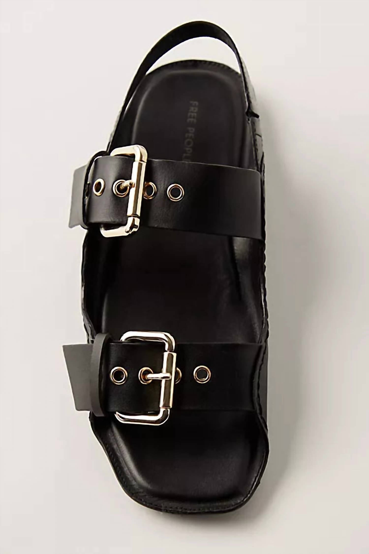 Discover the Women's Blossom Buckle Sandal by Free People, a chic addition to your summer wardrobe. These black sandals boast a slip-on style with leather uppers and slingback straps with elastic inlays for ultimate comfort. They feature adjustable chunky buckle straps and a thin rubber outsole for a playful contrast. Perfect for your next island escape, these sandals have a square open toe and a flat heel for effortless boho chic style.