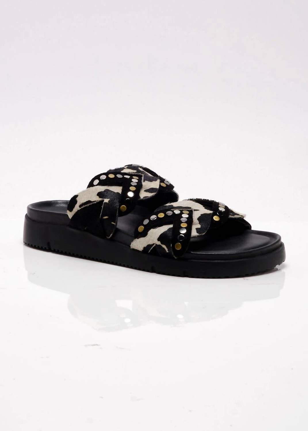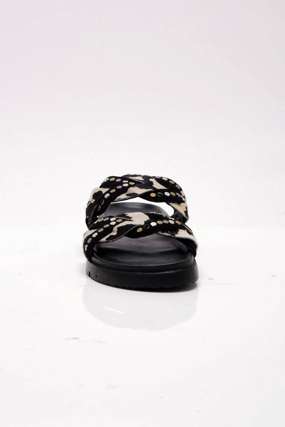 Flowy dresses, cropped pants, and even jumpsuits... this sandal works with them all! Step into summer with the Women's Leo Sandal by Free People, offering a chic blend of comfort and style. These sandals feature a slip-on, backless design with luxurious cow hair-on uppers and studded accents for a touch of quiet luxury. The open toe and flat soles make them an ideal choice for a variety of occasions, from casual hangouts to dinner parties. Elevate your summer wardrobe with these effortless slides that pair perfectly with any casual basics.