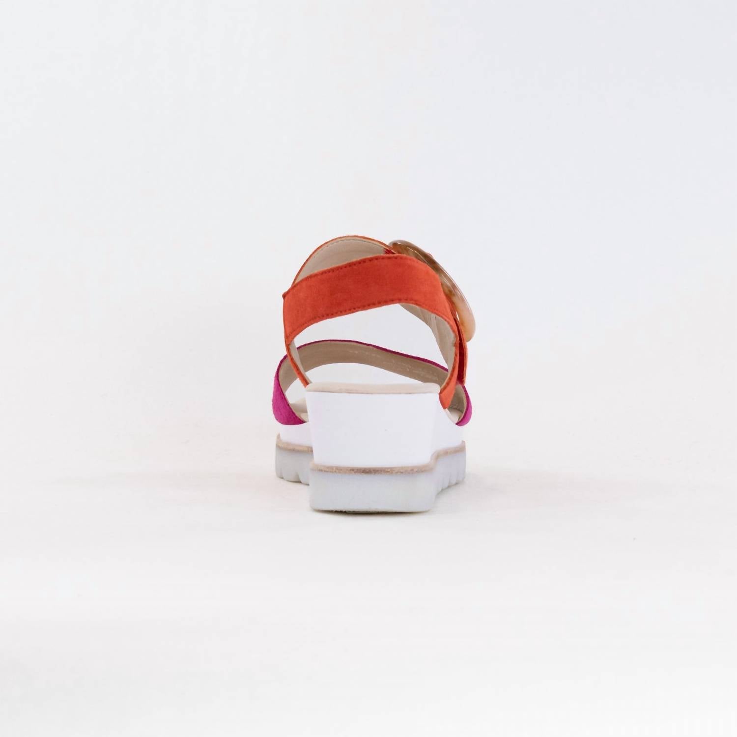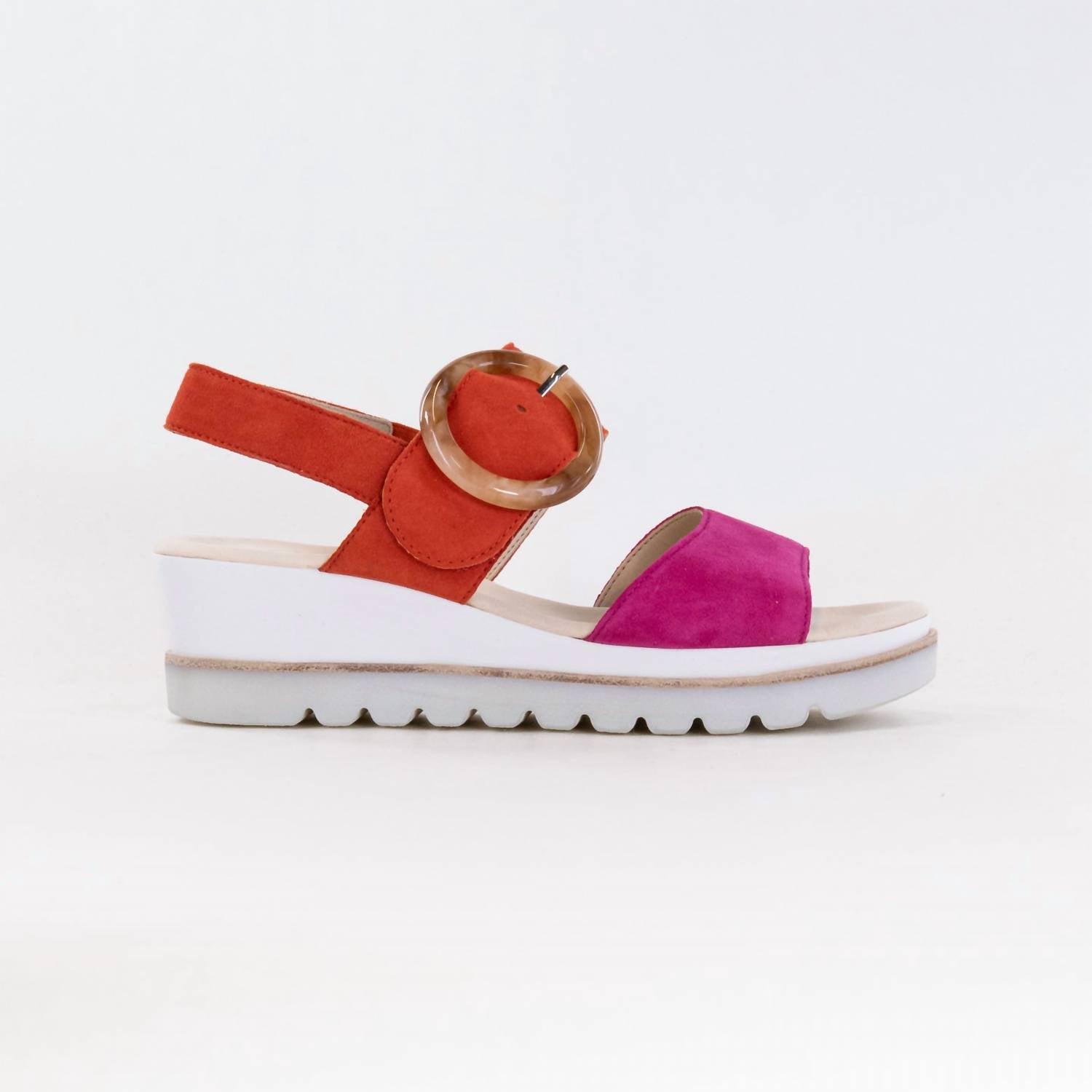 Classicly cute and all-day-wearable. We love this sandal. Gabor's Women's Wedge Sandal is a chic addition to any wardrobe, featuring stylish two-tone leather straps in Pink and Pumpkin. These sandals showcase an adjustable buckle for a personalized fit and utilize the innovative Hovercraft system for cushioned comfort. With a 2-inch wedge heel and a platform height of 1 inch, they offer both style and ease. Imported with a synthetic outsole and leather lining and insole, these sandals are designed for women seeking comfort and fashion.