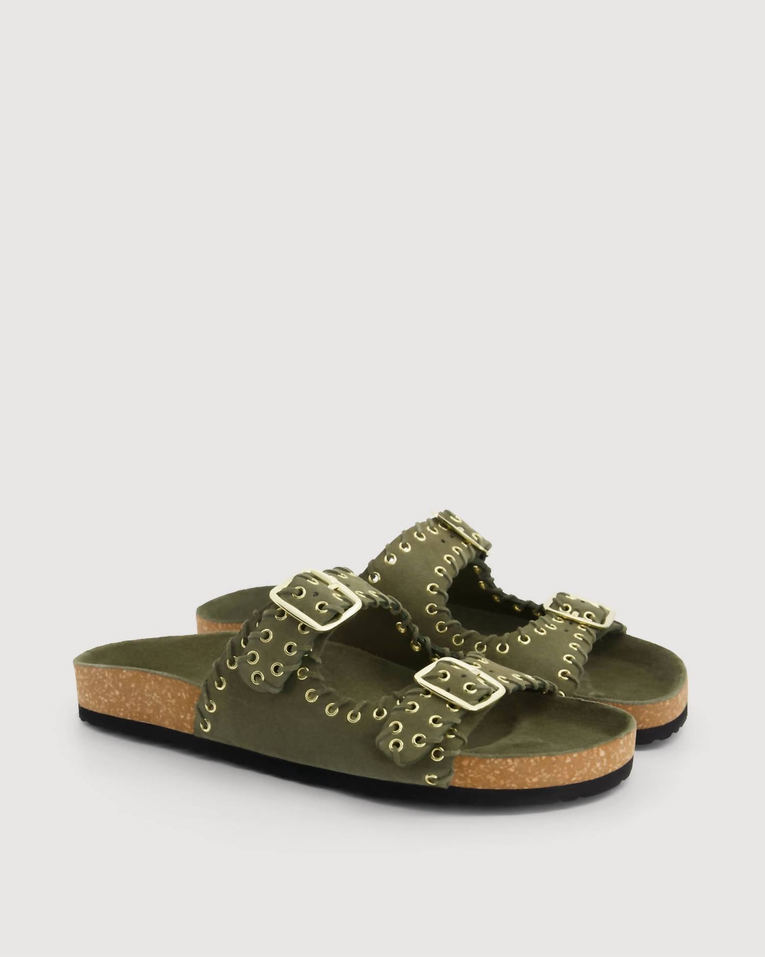 Classicly cute and all-day-wearable. We love this sandal. Step into effortless style with the Women's Ema Sandals by Hartford, perfect for any summer travel ensemble. These Army Green beauties boast an open toe design, with adjustable double straps adorned with gold eyelets and buckles, while the suede lacing adds a chic touch. Crafted from 100% suede leather, the sandals feature a comfortable cork sole that makes them ideal for both city streets and beach walks. Made in India, these sandals are a must-have accessory, especially for Mother's Day occasions.