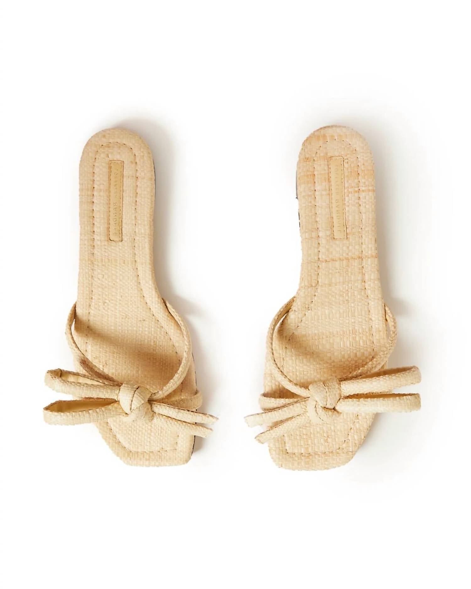 This sandal will take you from brunch to dinner and everything in between. Step into summer with the Women's Hadley Leather Bow Flat Sandal by Loeffler Randall, the perfect minimalist touch for your vacation wardrobe. Crafted in a natural hue, this sandal boasts a luxurious leather construction and an open, squared toe. The knotted bow detail adds a chic accent, while the padded footbed with a gold stamped logo ensures comfort. Made for women, this flat heel sandal is an elegant choice for any laid-back occasion.