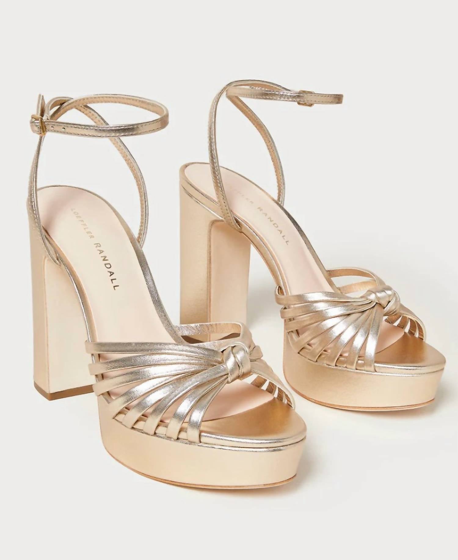 The perfect height for day to night. Step into elegance with the Women's Rivka Knot Platform Sandal by Loeffler Randall in metallic champagne. Crafted from luxurious nappa leather, these sandals boast a 5" platform heel and 3.5" covered leather platform for a height boost with sophisticated style. Featuring a pieced mignon strap and an adjustable buckle ankle strap, these sandals offer a perfect peep-toe fit for evening events. Note the sizing: this style fits slightly narrow, so consider sizing up 1/2 size for wider feet. Care for these delicate shoes by avoiding prolonged water exposure and seek professional refurbishment as needed.