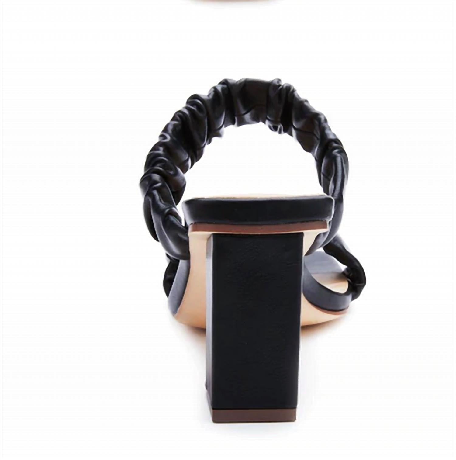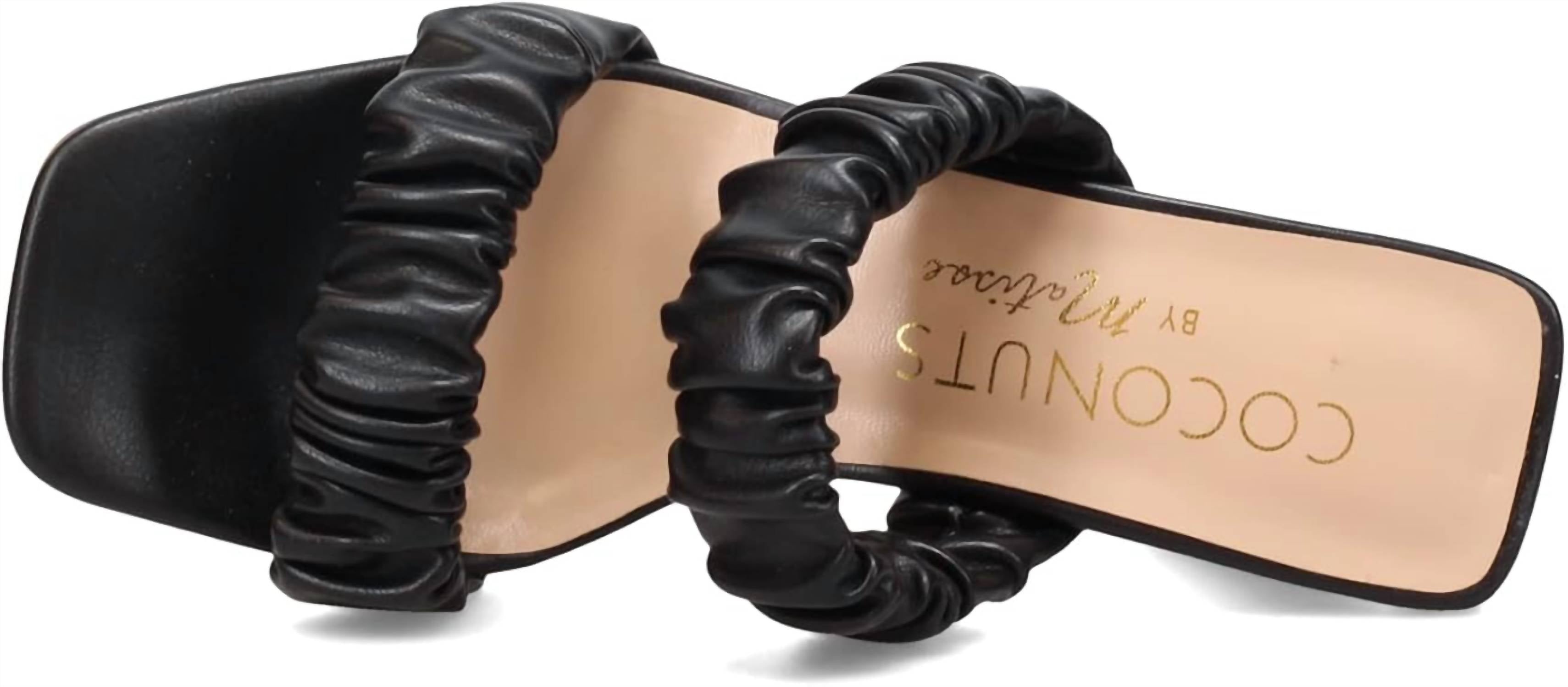 This sandal will take you from brunch to dinner and everything in between. Introducing the First Love Sandal by Matisse, a chic choice for every wardrobe in sleek black. These open-toe sandals boast ruched vegan leather straps on a stylish squared-off block heel, measuring 3.5 inches for the perfect elevation. Crafted with a rubber sole for added comfort, they're designed for women seeking both style and ease. Whole sizes only; if you're a half size, simply order the next size up for the best fit.