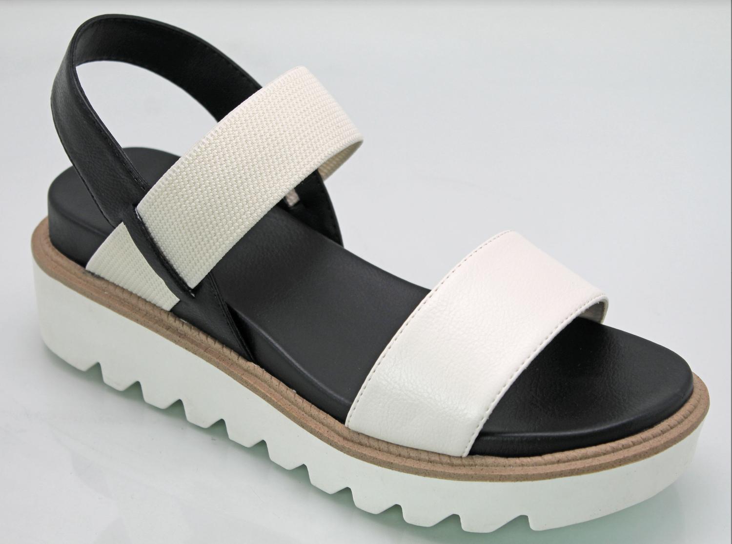 Classicly cute and all-day-wearable. We love this sandal. Embrace bold style with the Women's Jene Sneaker Bottom Sandal by MIA, a modern twist on classic summer footwear. Constructed from vegan leather, this sandal features a unique single strap vamp and asymmetrical elastic straps for easy wear, adding flair to any ensemble. It boasts an open toe design and a sleek white/black color palette that complements its signature 1.6-inch ridged platform sneaker bottom. Make it your go-to choice for streetwear-inspired looks and special occasions like Mother's Day or church gatherings.