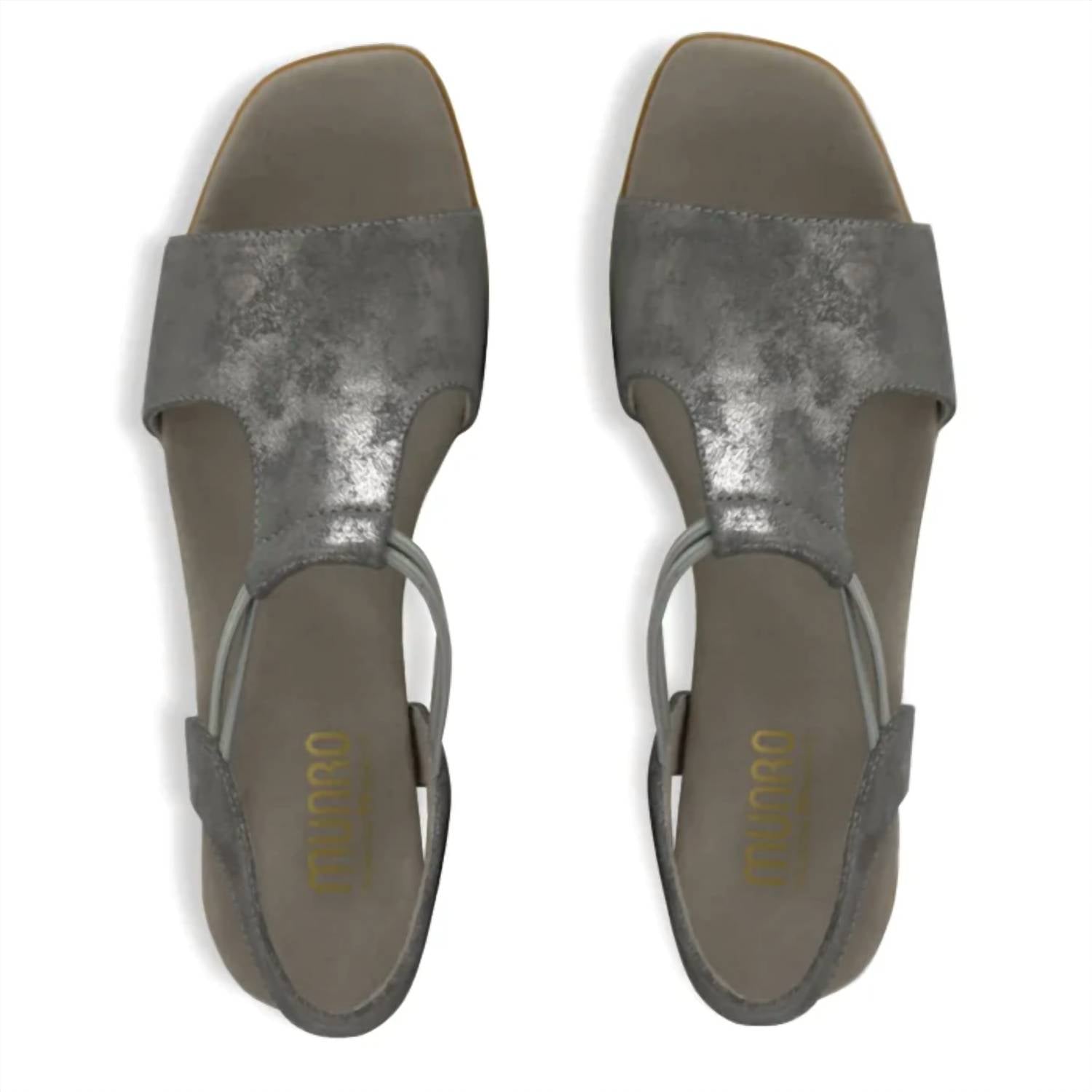 Classicly cute and all-day-wearable. We love this sandal. Step into elegance with the Women's Susan Sandal by Munro, designed in a striking Basalto/gunmetal color. This T-strap sandal features a wide-band vamp strap and stretch cross straps for a secure fit, complemented by a squared toe and block heel. The upper is crafted from soft leather with a shimmer print, lined with microfiber, and includes a wrapped padded insole with a riveted steel shank for stability. The 1.50-inch low heel height is perfect for an evening event, ensuring both comfort and style with its latex rubber outsole.