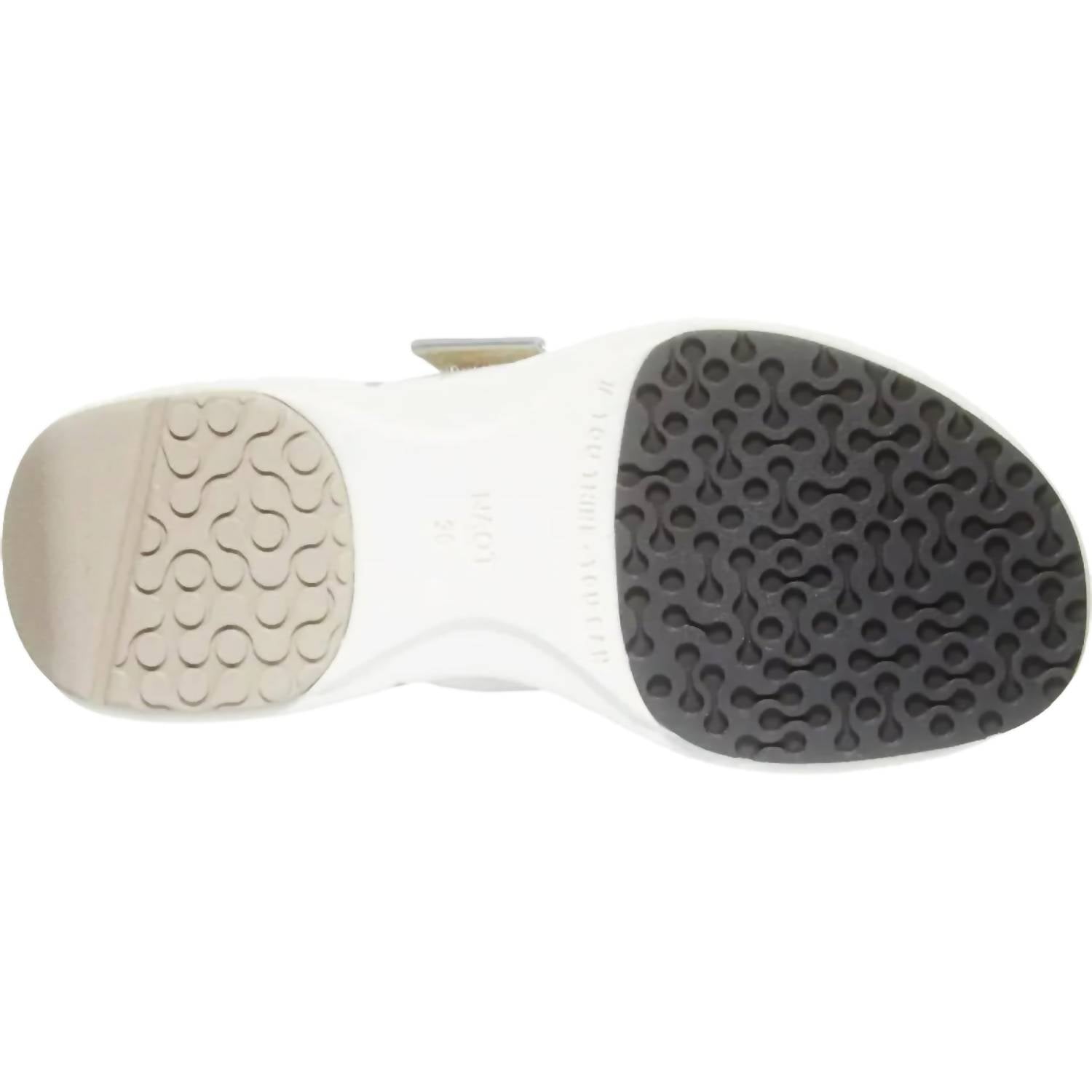 Classicly cute and all-day-wearable. We love this sandal. Revel in the perfect blend of style and comfort with the Women's Calliope Sandal by NAOT, presented in a chic Ivory Leather and Silver Grey palette. These sandals feature a lightweight rubber sole that ensures effortless movement and a 1.5" wedge heel for subtle elevation. Crafted from premium leather, they boast adjustable hook and loop straps that offer a secure fit, complemented by a removable, anatomic cork and latex footbed that molds to your foot over time. Ideal for those who prefer a round toe and a low heel height, these sandals guarantee true-to-size comfort—perfectly catering to half sizes that may choose to size up.