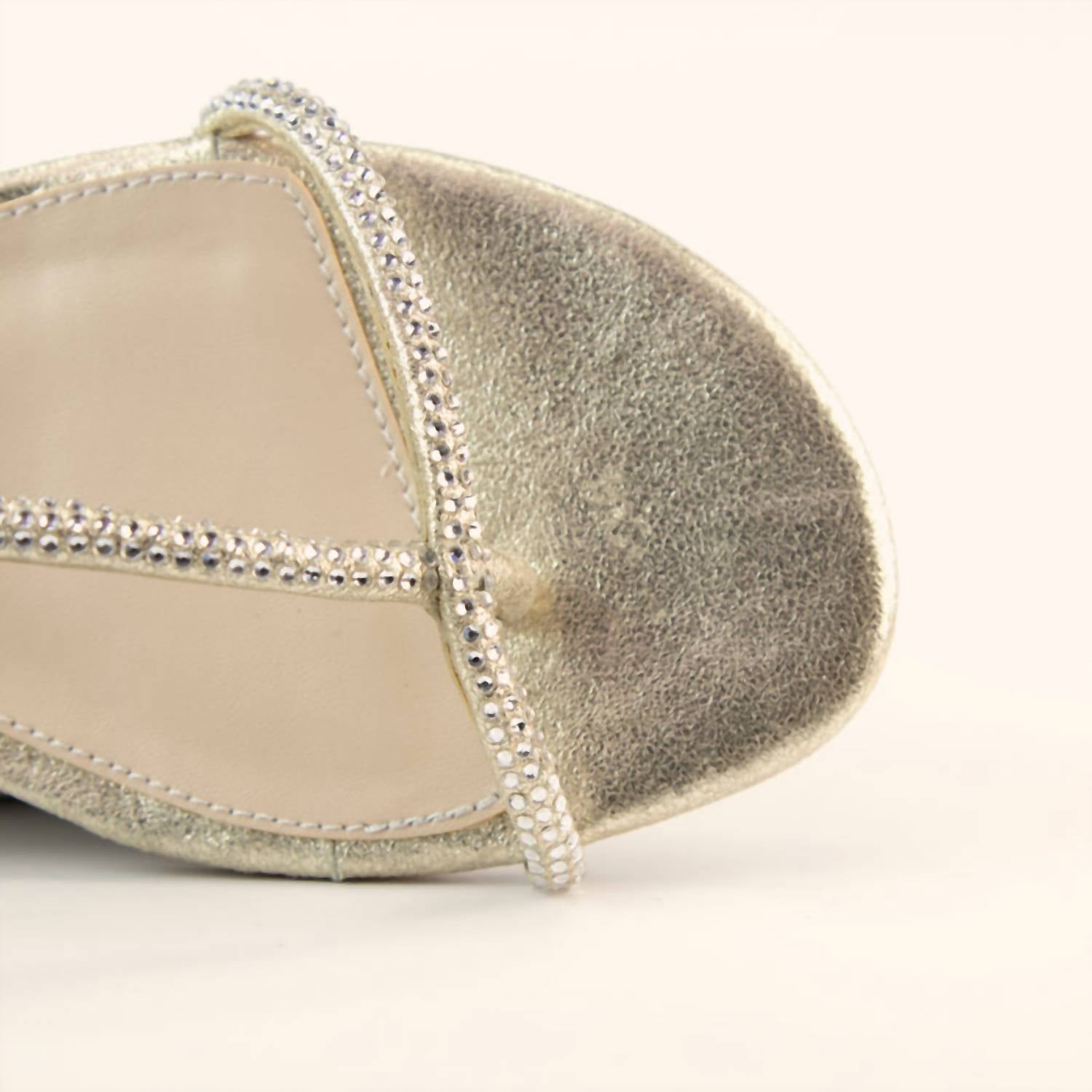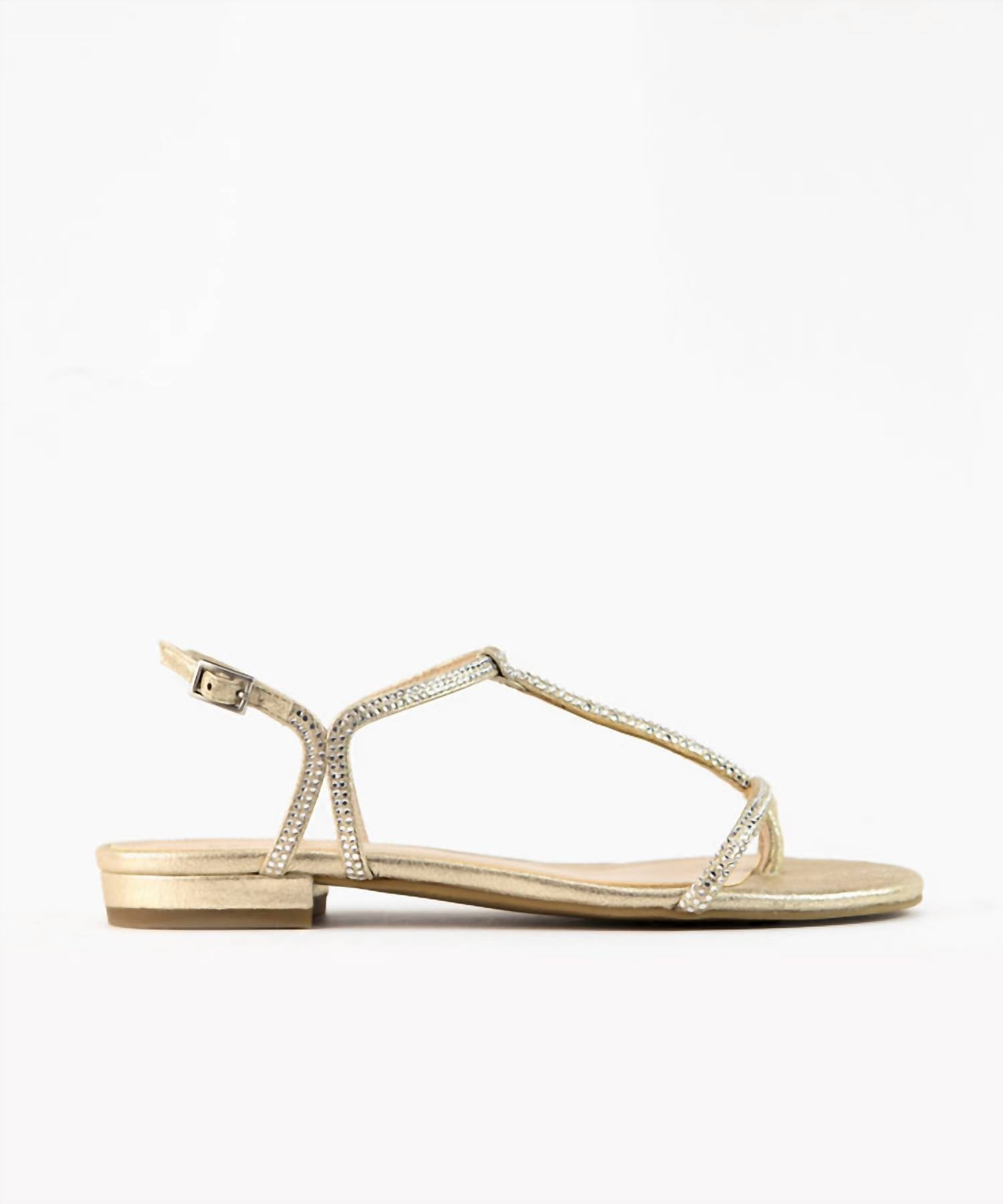 Classicly cute and all-day-wearable. We love this sandal. Elevate your warm-weather wardrobe with the Women's Barber Sandal by Pelle Moda, a standout piece featuring shimmering suede adorned with rhinestone jewel ornaments. This sandal is crafted with an open toe design and a comfortable flat heel, available in a radiant gold hue. Closure: Adjustable buckle closure. Perfect for transitioning from day to night with a modern, contemporary flair.