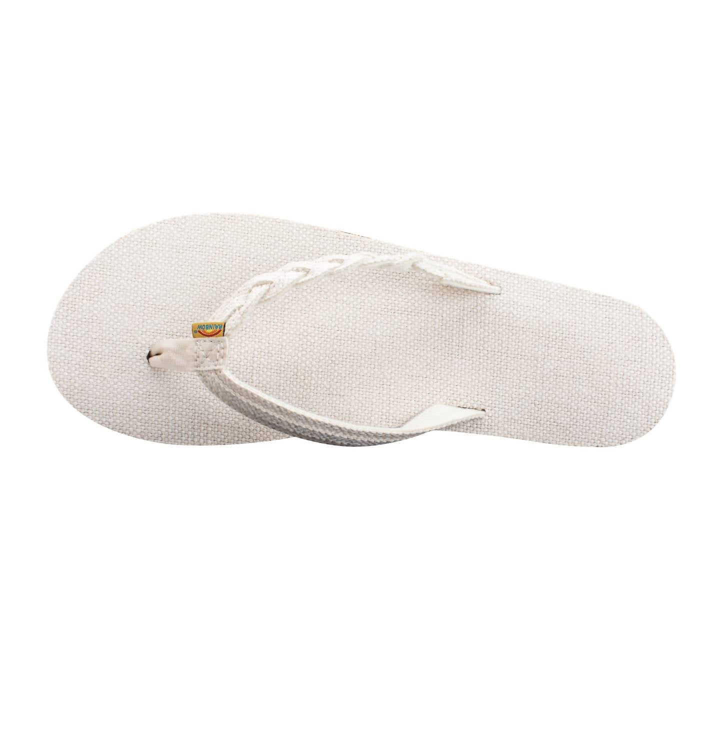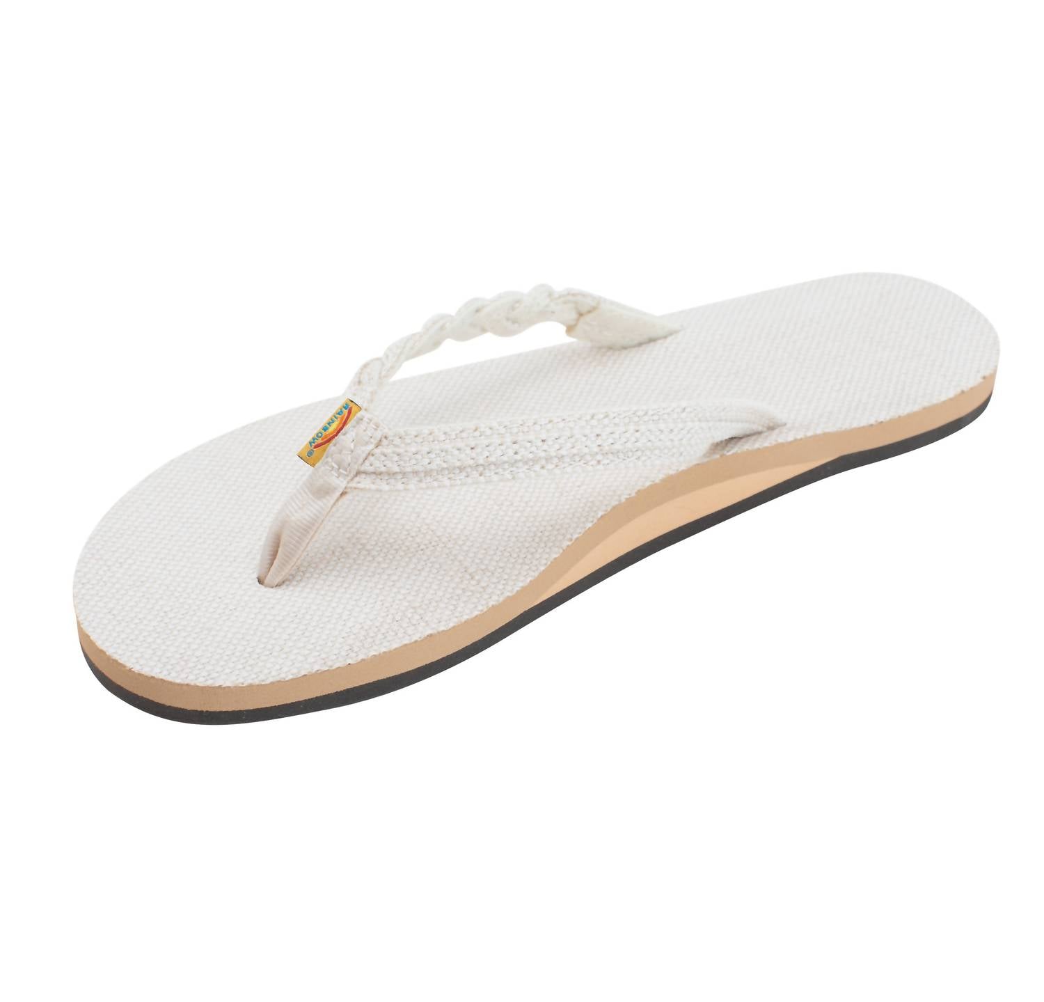 This sandal will take you from brunch to dinner and everything in between. Step into the ultimate summer streetwear with the Women's Hemp Flirty Braidy Sandal by Rainbow Sandals. These sandals boast an open toe and a flat heel, crafted from natural hemp fibers for durability and style. Featuring a braided outer strap, 1/2" narrow hemp strap, and double-stitched bonded nylon thread, they ensure secure comfort with every step. Accented with a stitched trim inside strap and an iconic Rainbow® woven label, these sandals are designed for effortless summer wear.