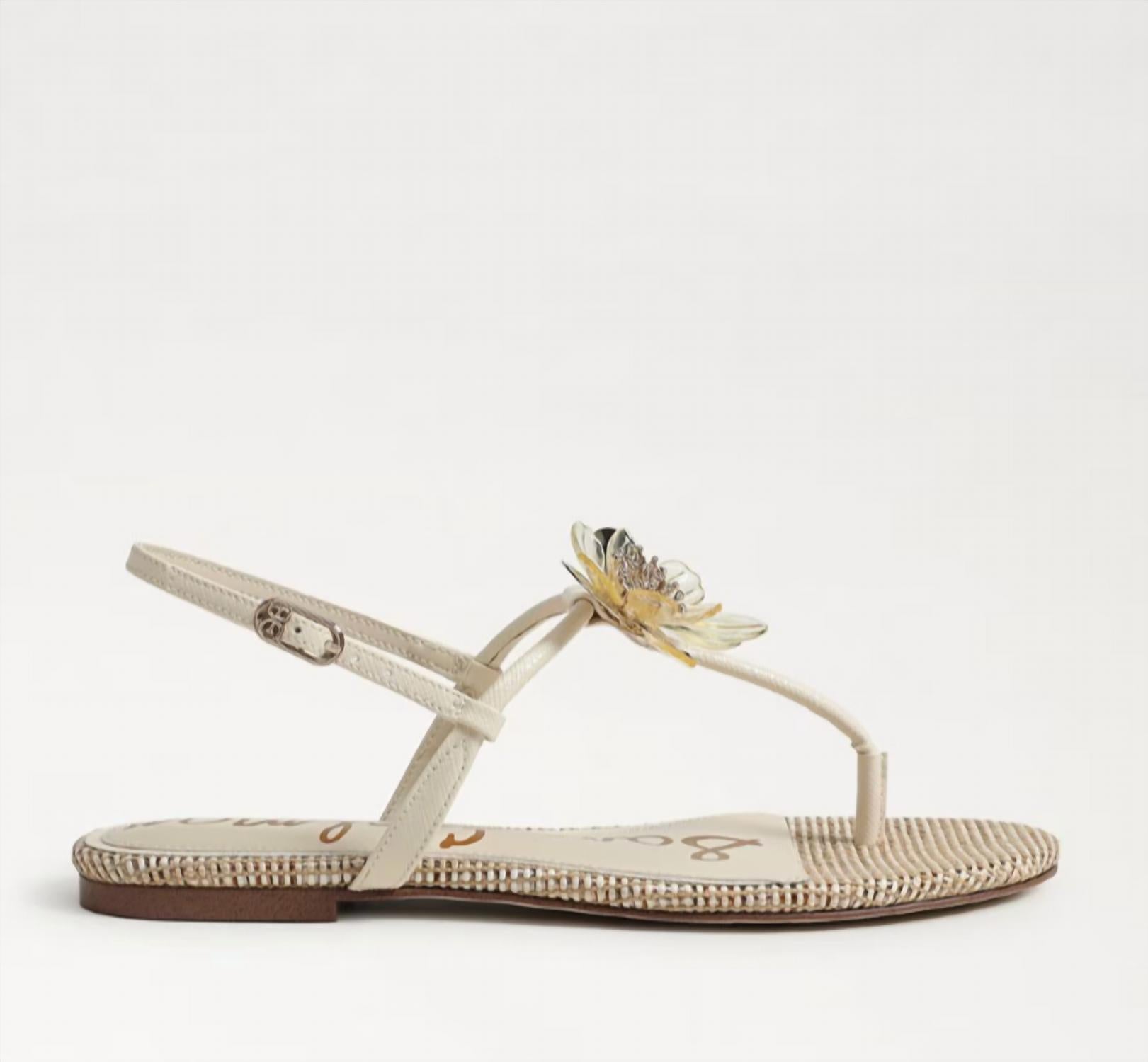 This sandal will take you from brunch to dinner and everything in between. Step into effortless elegance with the Sam Edelman Eden Thong Sandal in Modern Ivory. Featuring a chic floral embellishment, this sandal is crafted from synthetic materials, ensuring comfort and style with every step. The design includes a convenient buckle closure and an open round toe, perfectly paired with a flat heel height of 0.5 inches. Ideal for adding a touch of Boho Chic to your summer wardrobe.