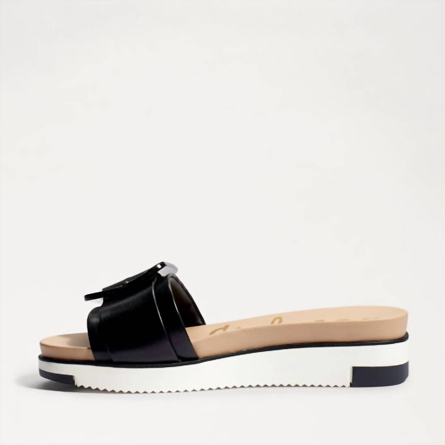 Classicly cute and all-day-wearable. We love this sandal. Step into comfort and style with the Women's Ariane Flat Sandals by Sam Edelman, featuring a lifted 1-inch platform and an exaggerated buckle for a trendy look. Crafted from a blend of leather and fabric, these sandals offer a round toe design perfect for strolling the beach or an afternoon outing. Closure: Slip on. Note: It is recommended to size down by half for the best fit.